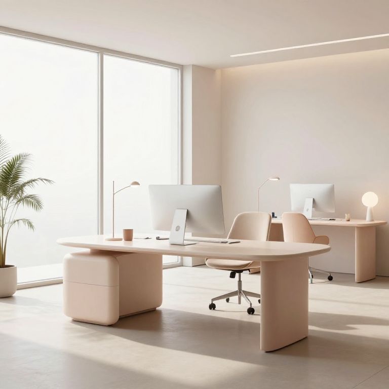 Streamline concept of an ultra-modern workspace with minimalist furniture and smooth surfaces, natural light flooding large windows, clean lines and organic shapes creating a calm, productive environment, soft pastel colors and subtle futuristic details.