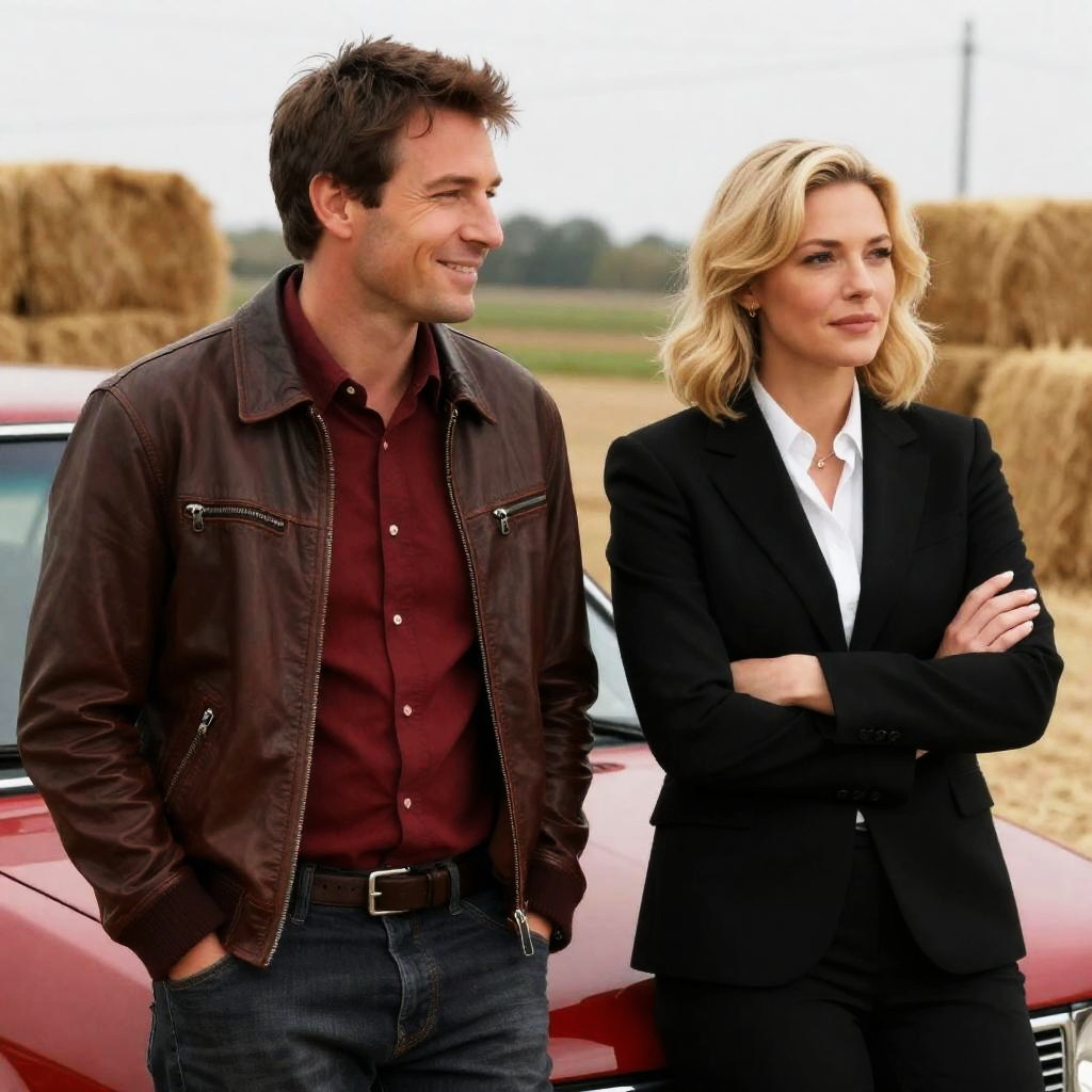 Photograph of a man and woman standing next to a large military aircraft. Both wear brown leather jackets with fur collars. Man has dark hair, blue shirt; woman has blonde hair, green scarf. Man leans on aircraft's propeller. Clear sky background. Woman's hand on aircraft's step.