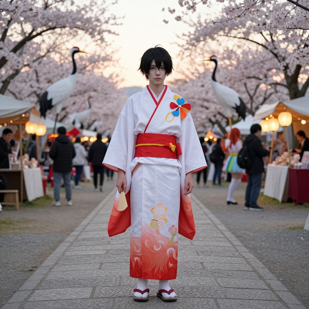 A detailed cosplay matsuri costume of a noble samurai maiden, complete with a flowing kimono, red obi belt, and a small fan, worn by a young man with sharp facial features, pale skin, and a calm expression, standing on a stone pathway in a cherry blossom-lined festival grounds during golden hour, surrounded by fire cranes, food stalls, and dancers.