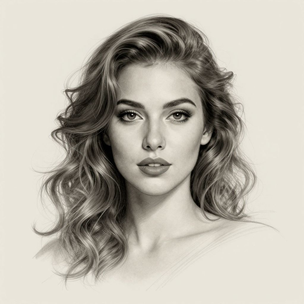 Elegant sketch portrait featuring a woman with intricately styled wavy hair, captured in grayscale tones against a soft beige background, showcasing detailed shading and lifelike facial features.