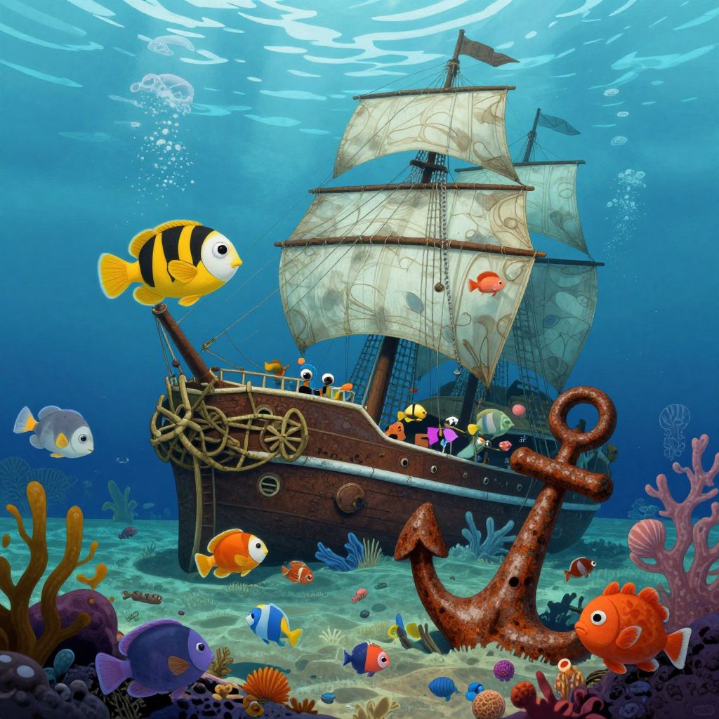 Digital artwork in Mary Blair's style showcasing a vibrant underwater scene featuring a sunken sailing ship with weathered sails, surrounded by diverse colorful fish and sea creatures. The scene includes a large rusted anchor resting on the sandy sea floor amid coral formations and marine plants, creating a magical and harmonious blend of nature and remnants of human civilization.