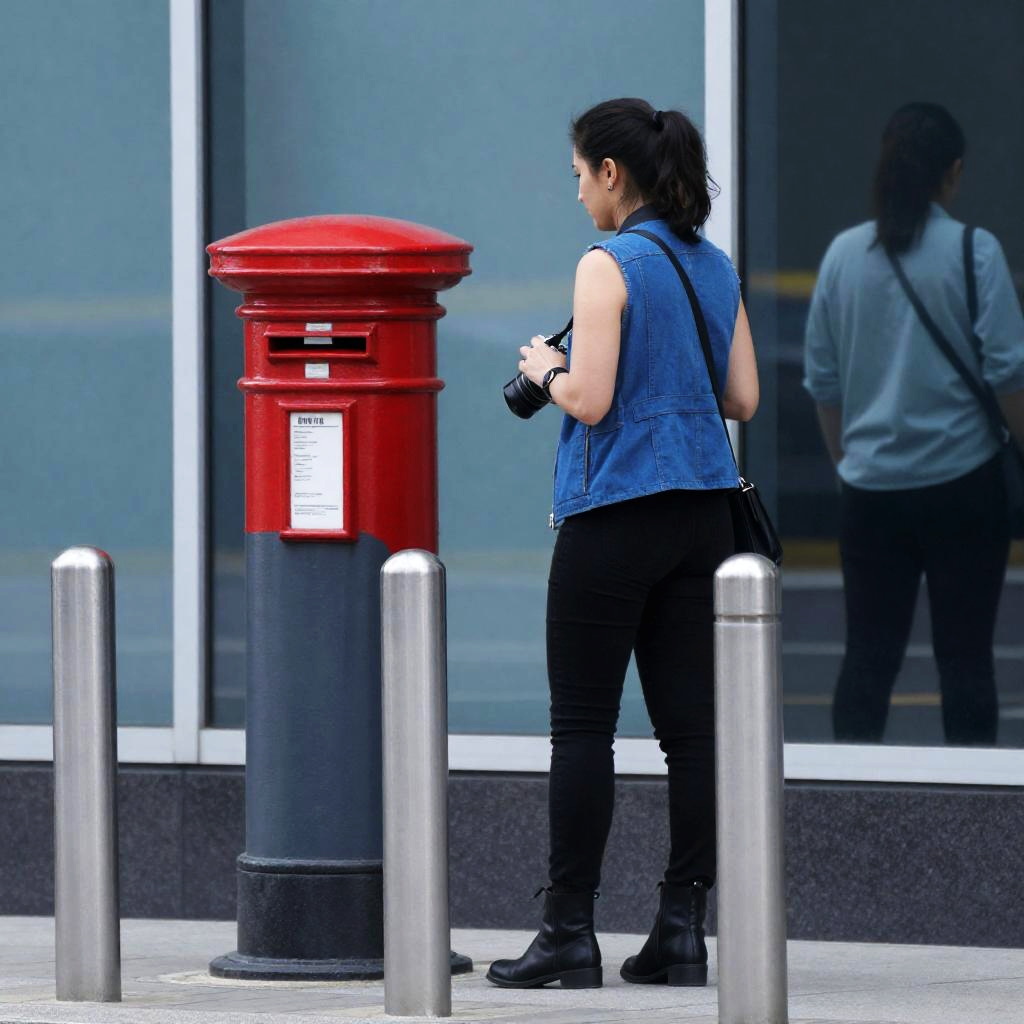 Photograph of a woman with dark hair in a ponytail, wearing a sleeveless blue top and black pants, holding a camera to her eye. She stands next to a red mailbox and black chair, against a blue plastic-covered background. She looks focused.