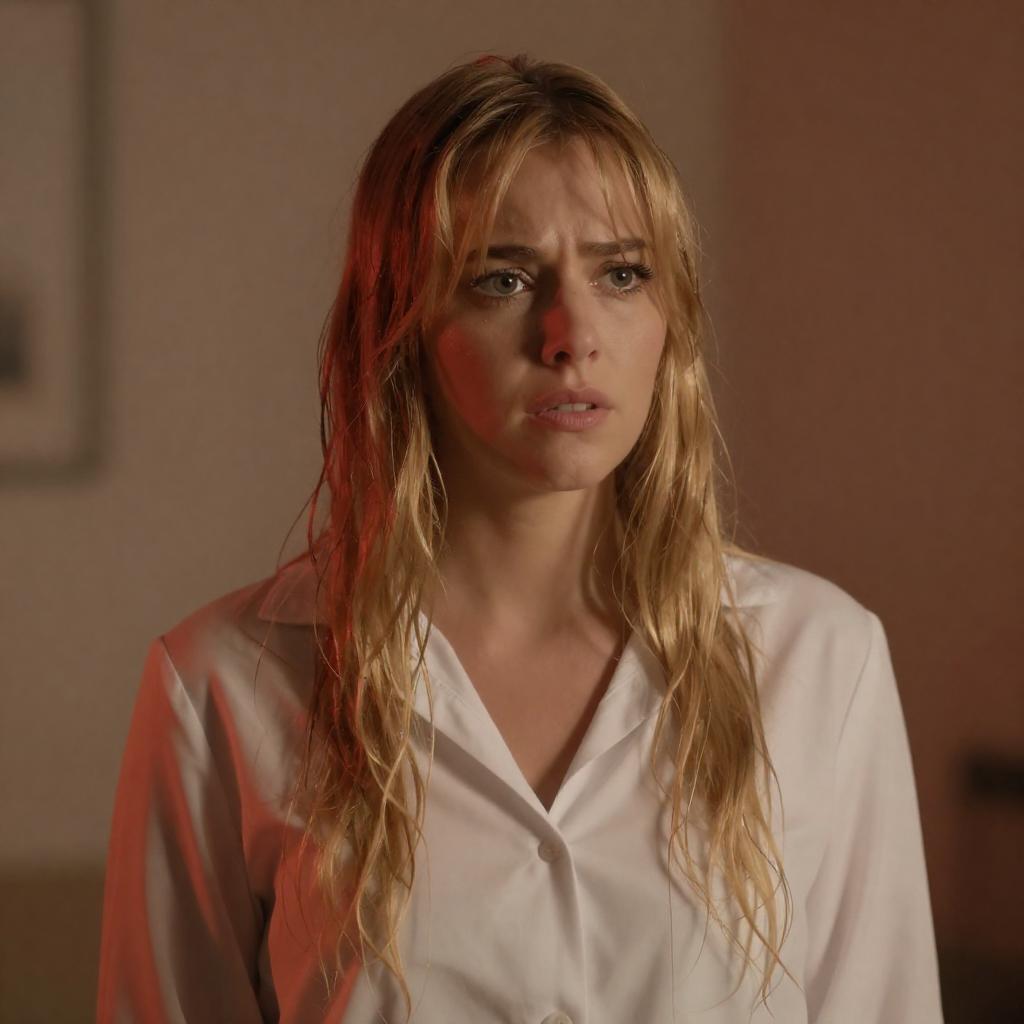 A photograph of a young blonde woman with shoulder-length hair, wearing a blood-stained, beige, long-sleeve sweater. She stands against a dark, shadowy background, looking slightly to the side with a concerned expression. The lighting is dim, highlighting her face and the blood on her sweater.