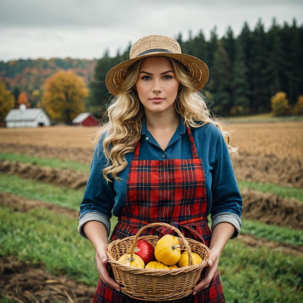 Photorealistic image of a young Caucasian woman with blonde wavy hair wearing a straw hat, blue shirt, and red plaid apron. She stands in an autumn countryside field holding a wicker basket filled with small yellow and red pumpkins. The background features blurred trees and rustic farm buildings under an overcast sky with natural light, creating a calm rural atmosphere.