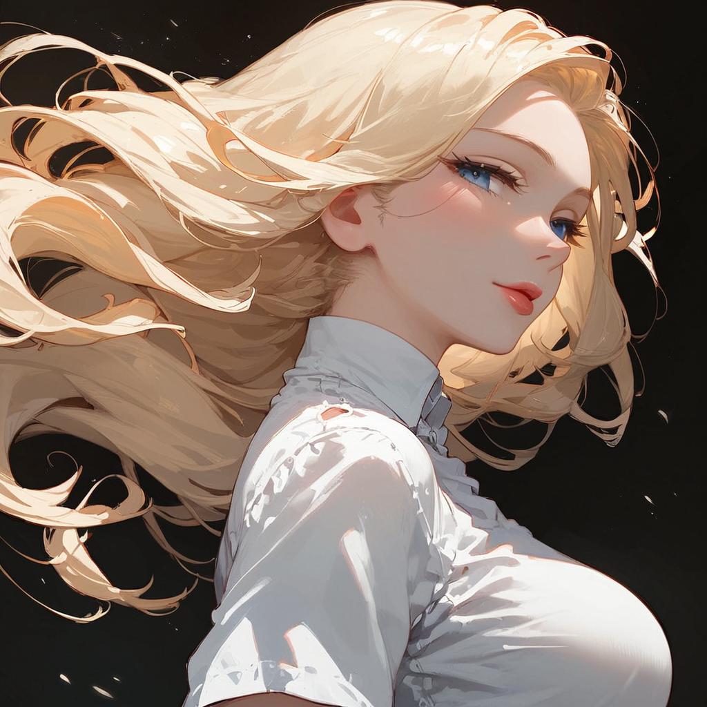 Score_9, score_8_up, score_7_up, score_6_up, solo, blonde hair, black background, long hair, looking at viewer, simple background, upper body, blue eyes, parted lips, breasts, floating hair, from side, aqua eyes, medium breasts, shirt
