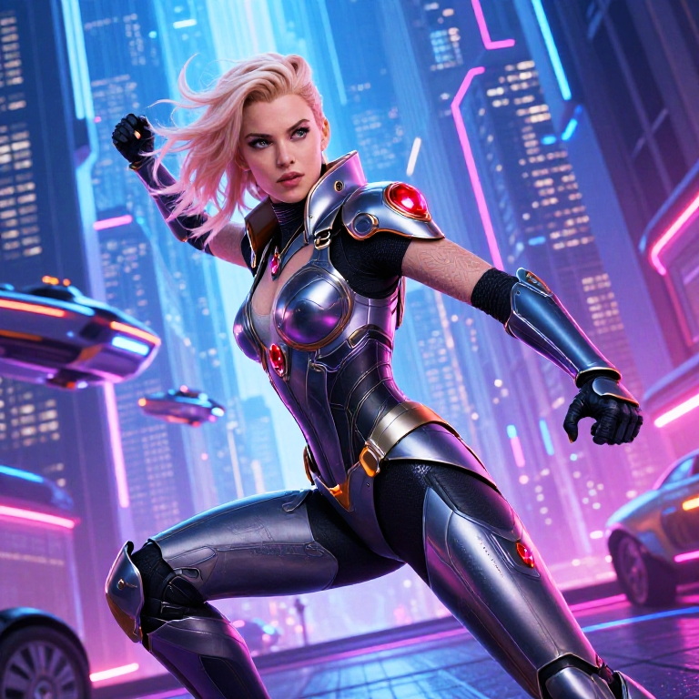 Photorealistic digital artwork of a red-haired woman in a shiny, red, armored costume with heart-shaped gems, standing in a neon-lit,