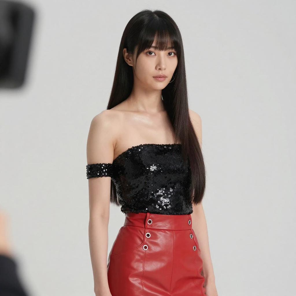 Photograph of an Asian woman with long black hair and bangs, wearing a strapless black sequined top with sparkly arm bands and a high-waisted red leather skirt with silver rings. She's standing against a plain white background, slightly turned to her left, looking at the camera with a neutral expression. The lighting is soft and even, with a shallow depth of field that keeps her in sharp focus while the background is blurred. The camera angle is slightly below eye level, capturing her from the waist up.