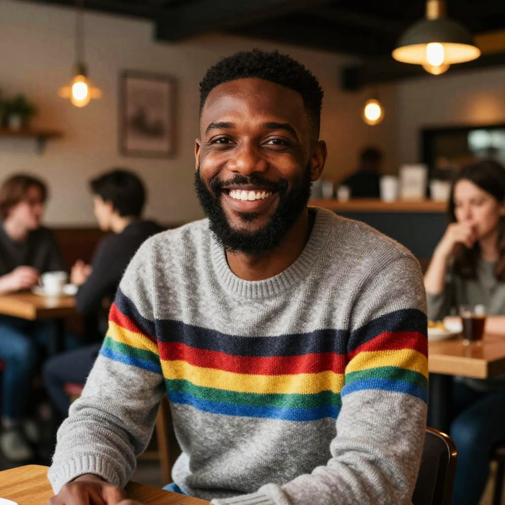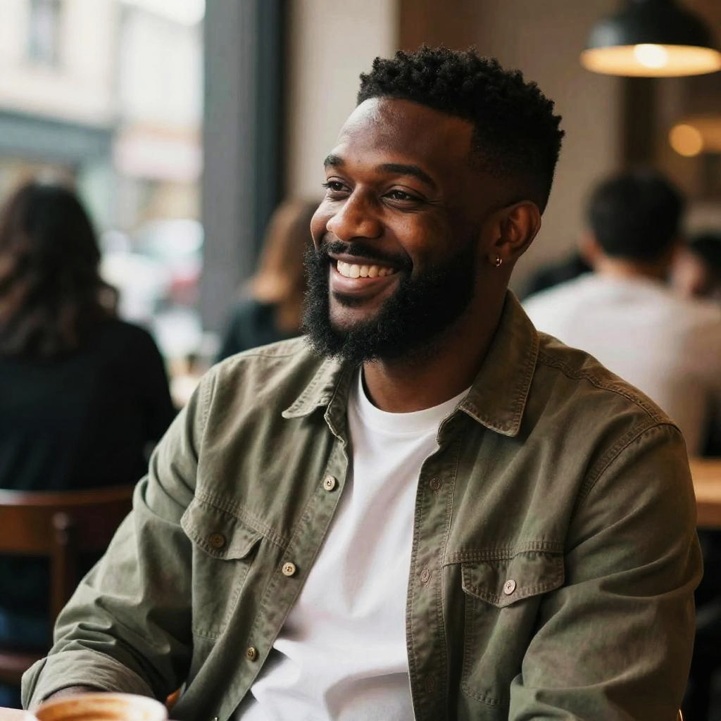 Photograph of a smiling Black man with a short, curly afro and full beard, wearing a white t-shirt and olive green button-up shirt. He has a small earring in his left ear and is seated in a softly lit, cozy café with a blurred background of other patrons. The lighting highlights his warm expression, and the café has a warm, inviting atmosphere with wooden furniture and soft yellow pendant lights.
