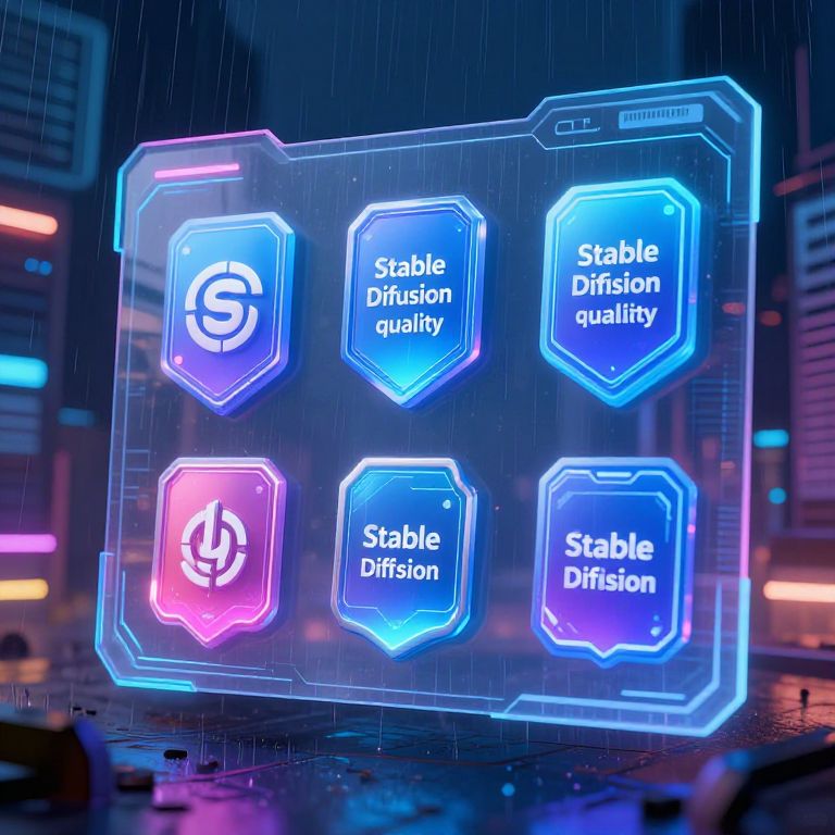 Stable diffusion quality tags styled as futuristic digital badges on a transparent virtual screen, ambient neon light reflections, cyberpunk cityscape in background with rain effects, holograms and sleek UI components, vibrant contrast and crisp detail