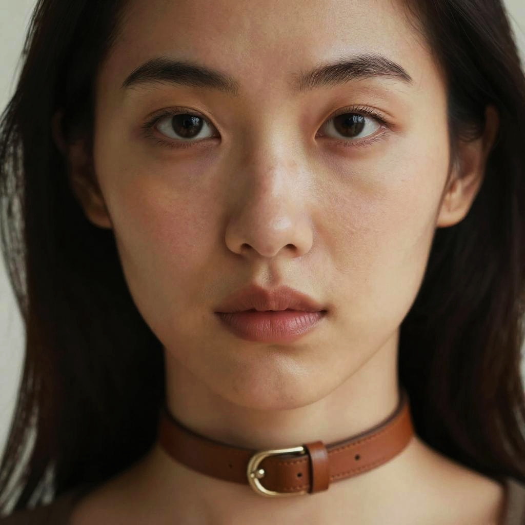 Photograph of a young Asian woman with fair skin, straight black hair, and dark brown eyes. She has a neutral expression with slightly parted lips. She wears a brown leather choker with a brass buckle around her neck. The background is a plain, light-colored wall, making her face the focal point. The image is sharply focused, highlighting her smooth skin texture and natural makeup. The lighting is soft, casting minimal shadows. The choker adds a subtle, stylish touch to her otherwise simple appearance.
