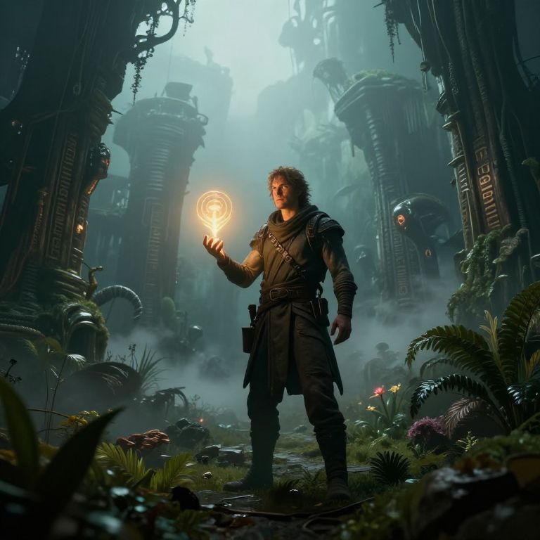 Gaffer lonely human, living in a science fiction universe, looking over a wormhole hole, a fantasy universe on the other side - Upscaled by,