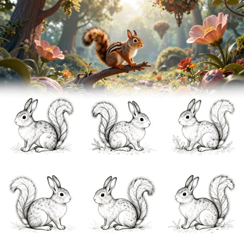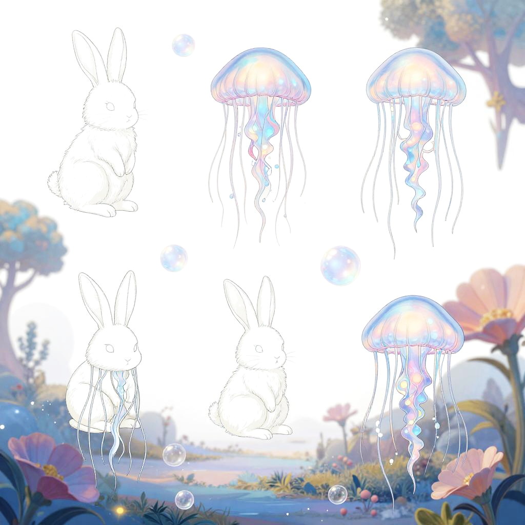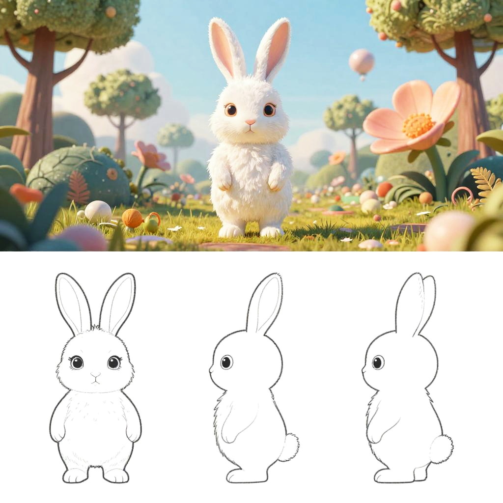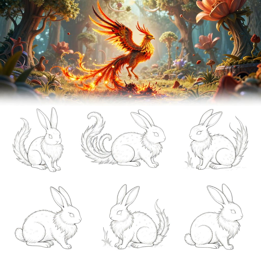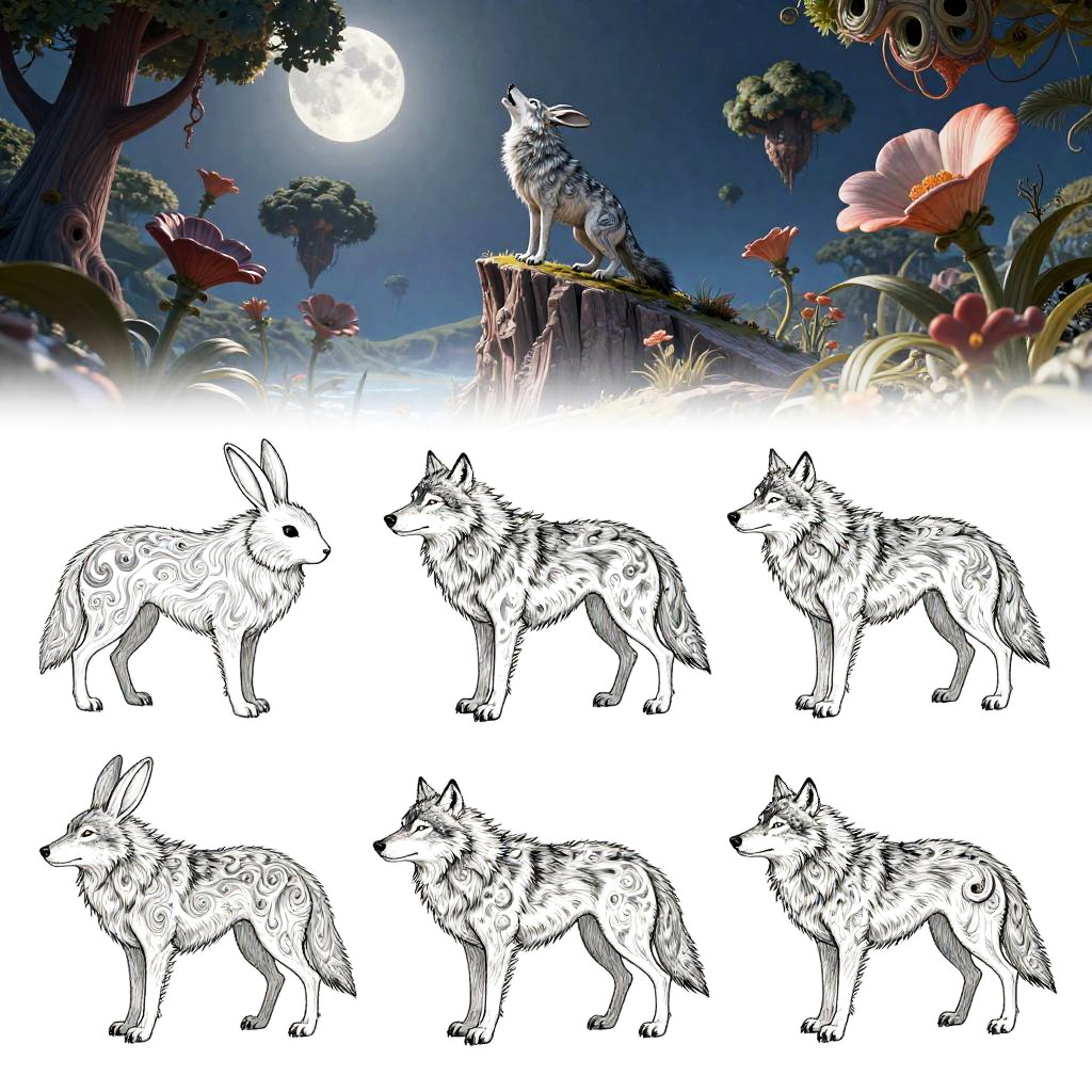 Wide-angle depth of field, ethereal wolf line art in different poses, on a white background. The bunny features surreal details like shimmering nebula fur, in unusual positions like howling atop glowing rocks. The background is a dreamlike, distorted landscape with surreal elements like floating trees and giant flowers, rendered in 9:16 aspect ratio.