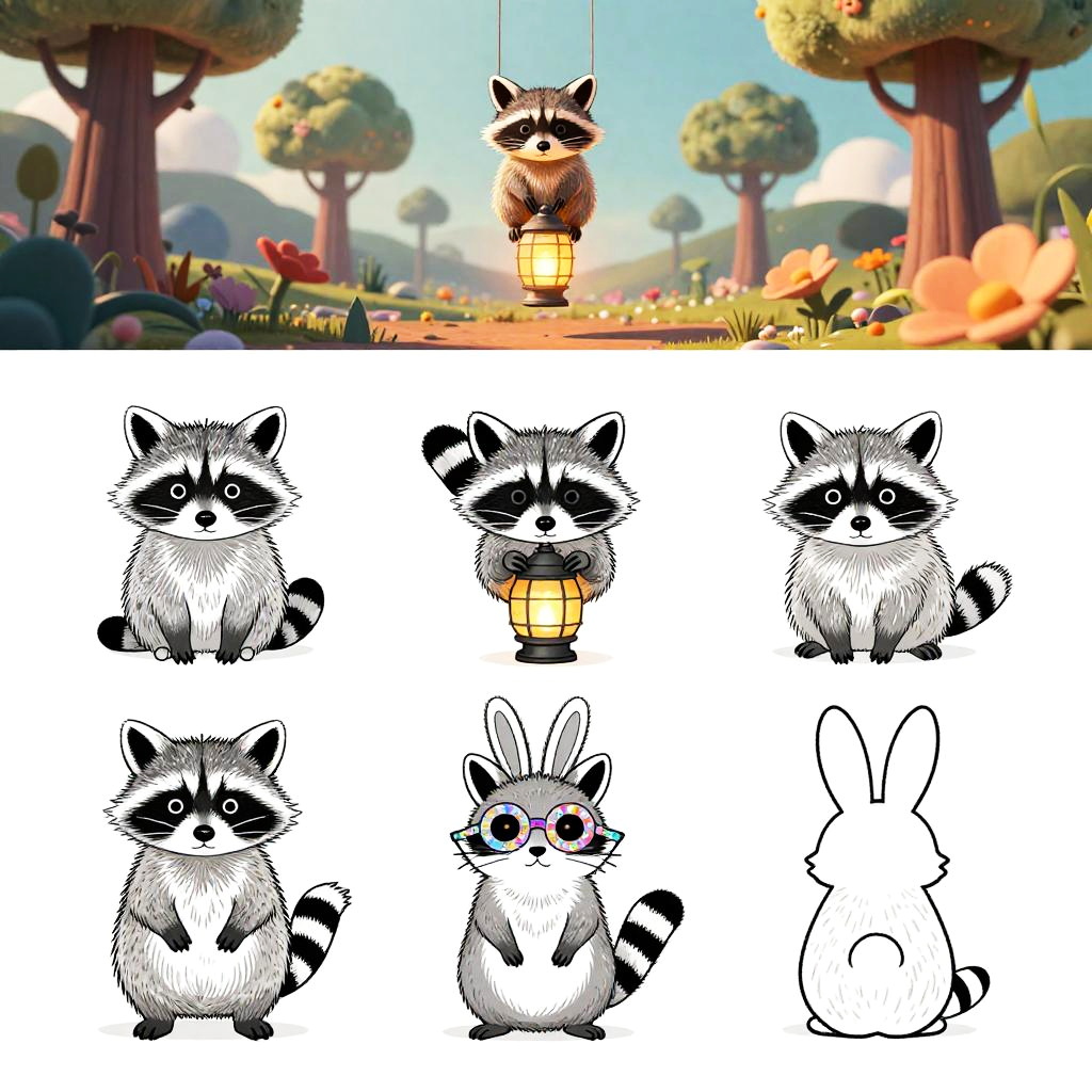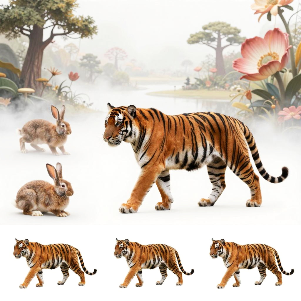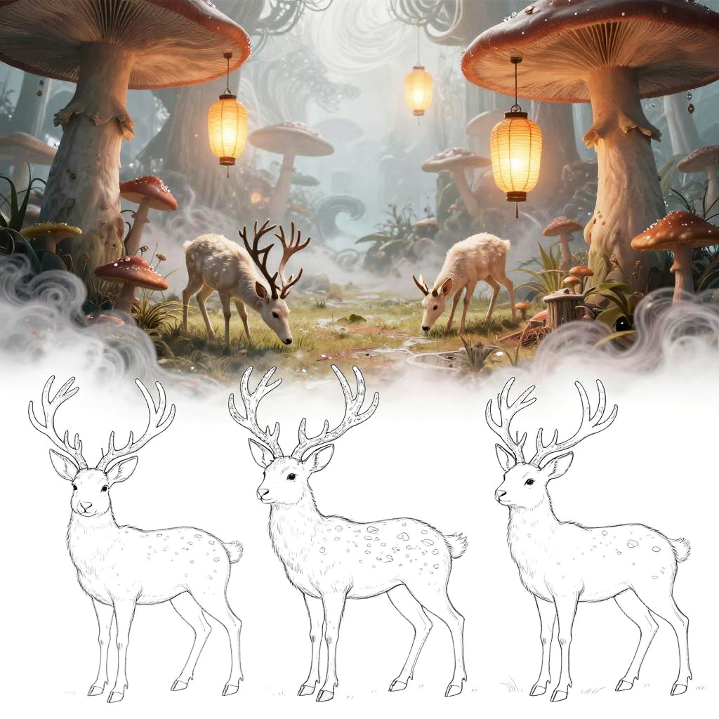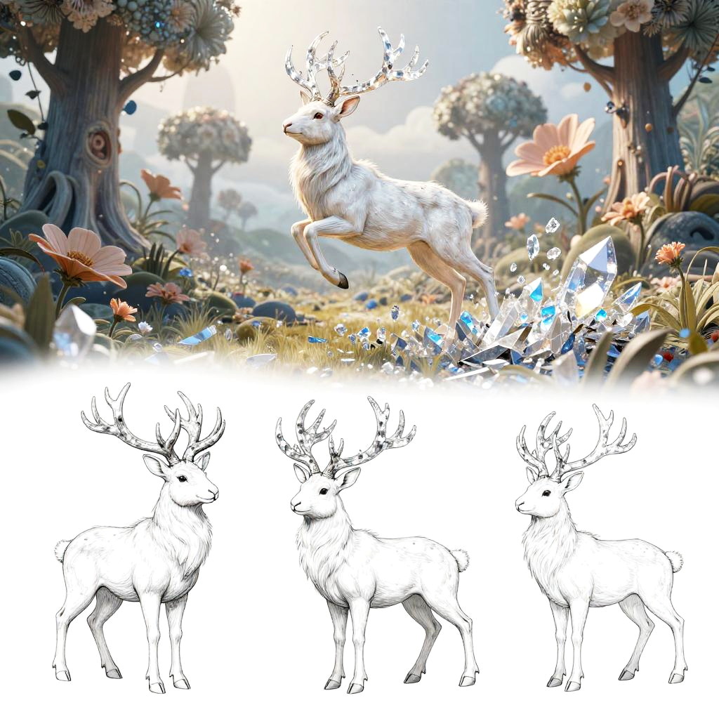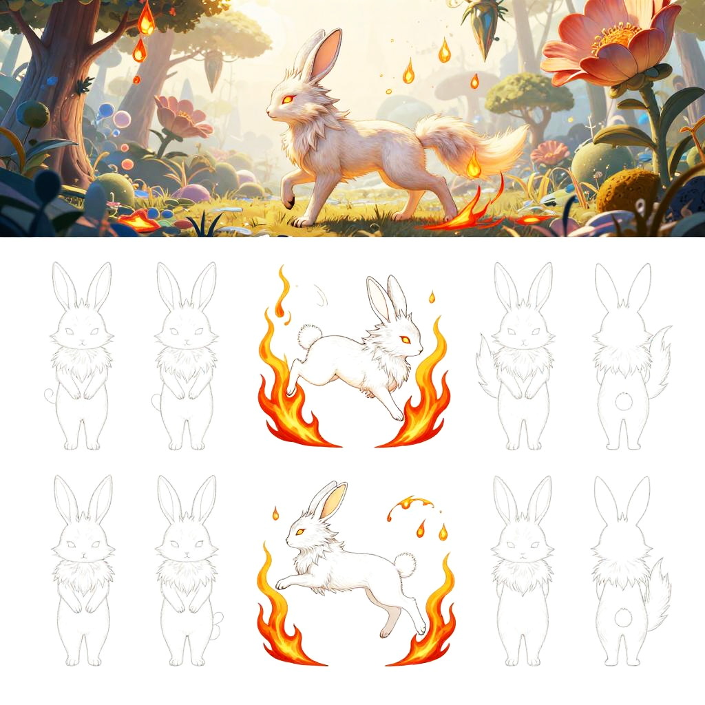 Wide-angle depth of field, ethereal wolf line art in different poses, on a white background. The bunny features surreal details like shimmering nebula fur, in unusual positions like howling atop glowing rocks. The background is a dreamlike, distorted landscape with surreal elements like floating trees and giant flowers, rendered in 9:16 aspect ratio.
