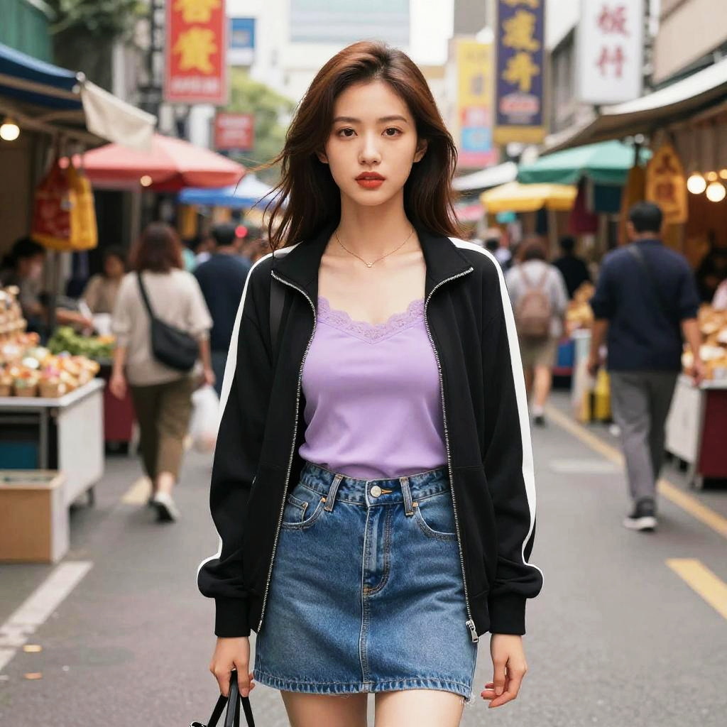 A slim woman in a sleeveless denim mini dress with a pointed collar and front button fastening, standing at a retro diner with a jukebox, illustrated in an image comics style. Sexy. Pretty face and beutiful eyes