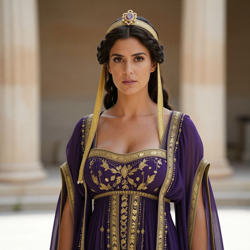 Photograph of a woman with dark hair, wearing an ornate purple and gold ancient Greek-style dress, gold headpiece, and serious expression, standing