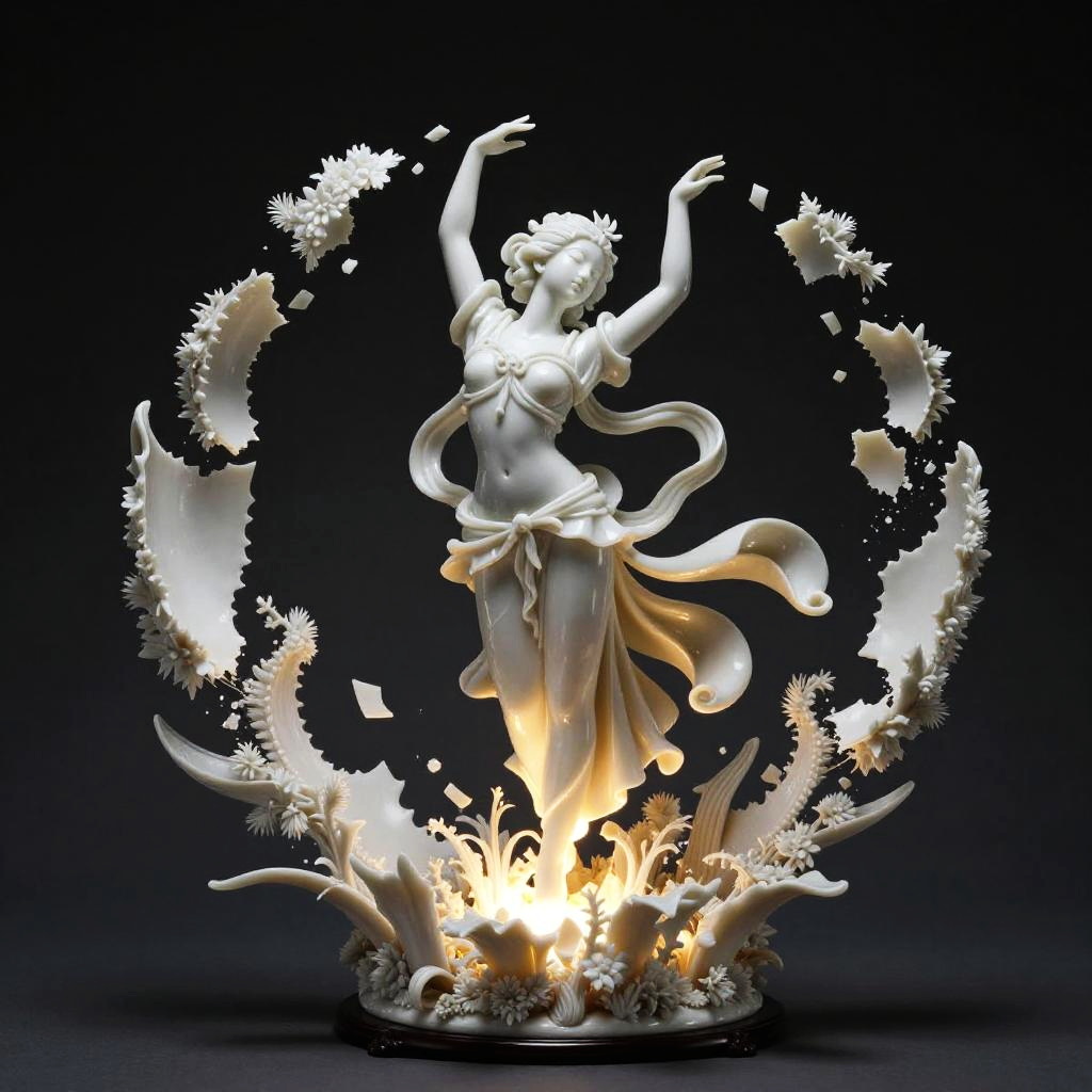 Theirfore: a delicate porcelain sculpture coming to life, fragments floating and assembling, glowing with inner light against a dark background, symbolizing rebirth and transformation, detailed and elegant