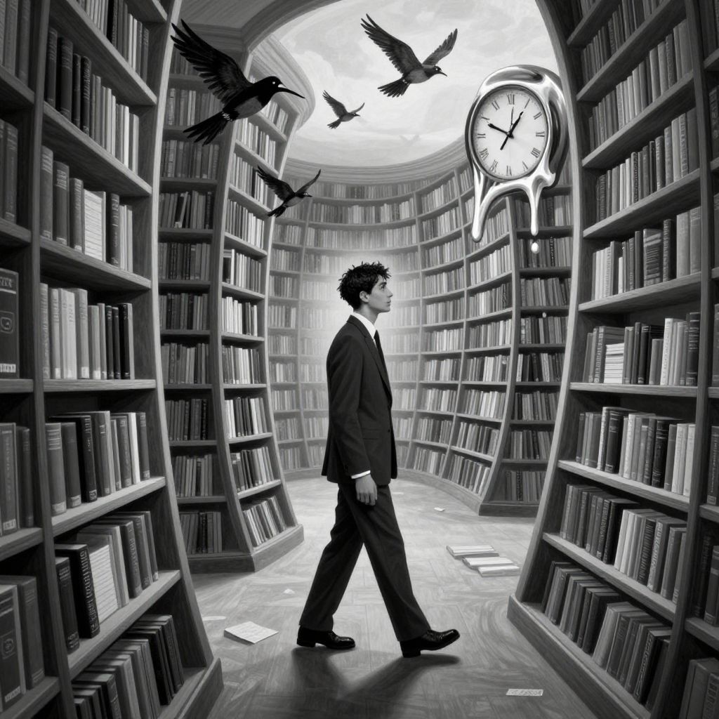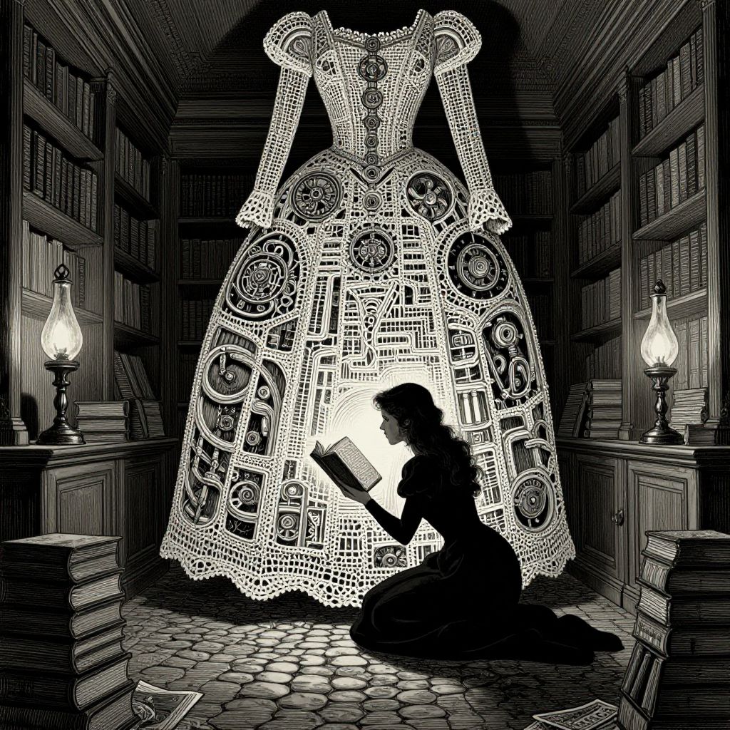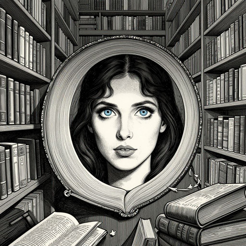 Imagine an enthralling image where a captivating portrait of a woman with striking blue eyes is captured in a style reminiscent of intricate ink illustrations, evoking the haunting beauty found within Edward Gorey's distinctive artwork. She exudes enigma as she leans against an ancient library filled with countless volumes and towering shelves that extend into a maze-like backdrop. The unique perspective reveals a wormhole view from within the pages of the books, creating a mesmerizing depth that intensifies the sense of exploration and fascination, as if journeying through the depths of her captivating gaze while navigating the labyrinthine corridors of knowledge.