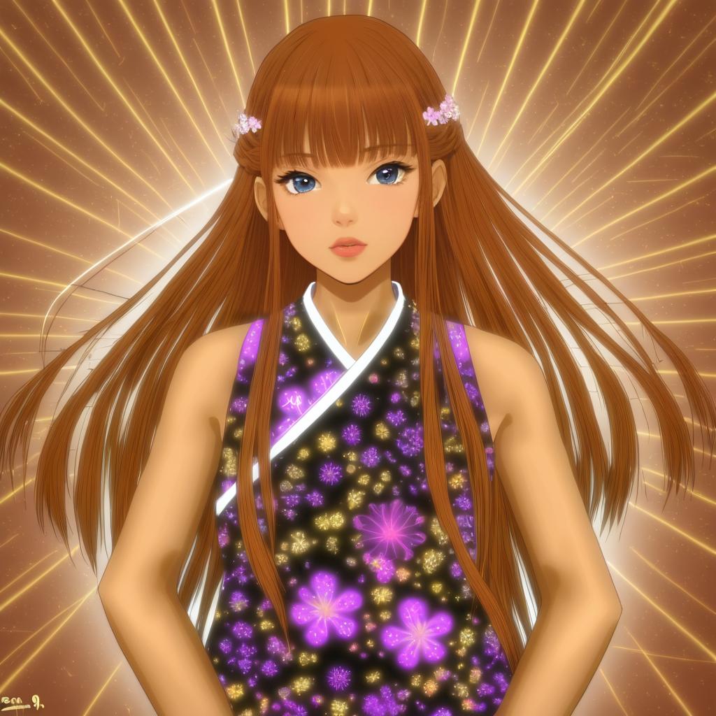 Digital anime illustration of a girl with long brown hair styled in a half updo adorned with small pink flowers. She has brown eyes and wears a sleeveless black dress with a vibrant purple and gold floral pattern. The background features radiant golden light rays, creating a glowing effect around her.