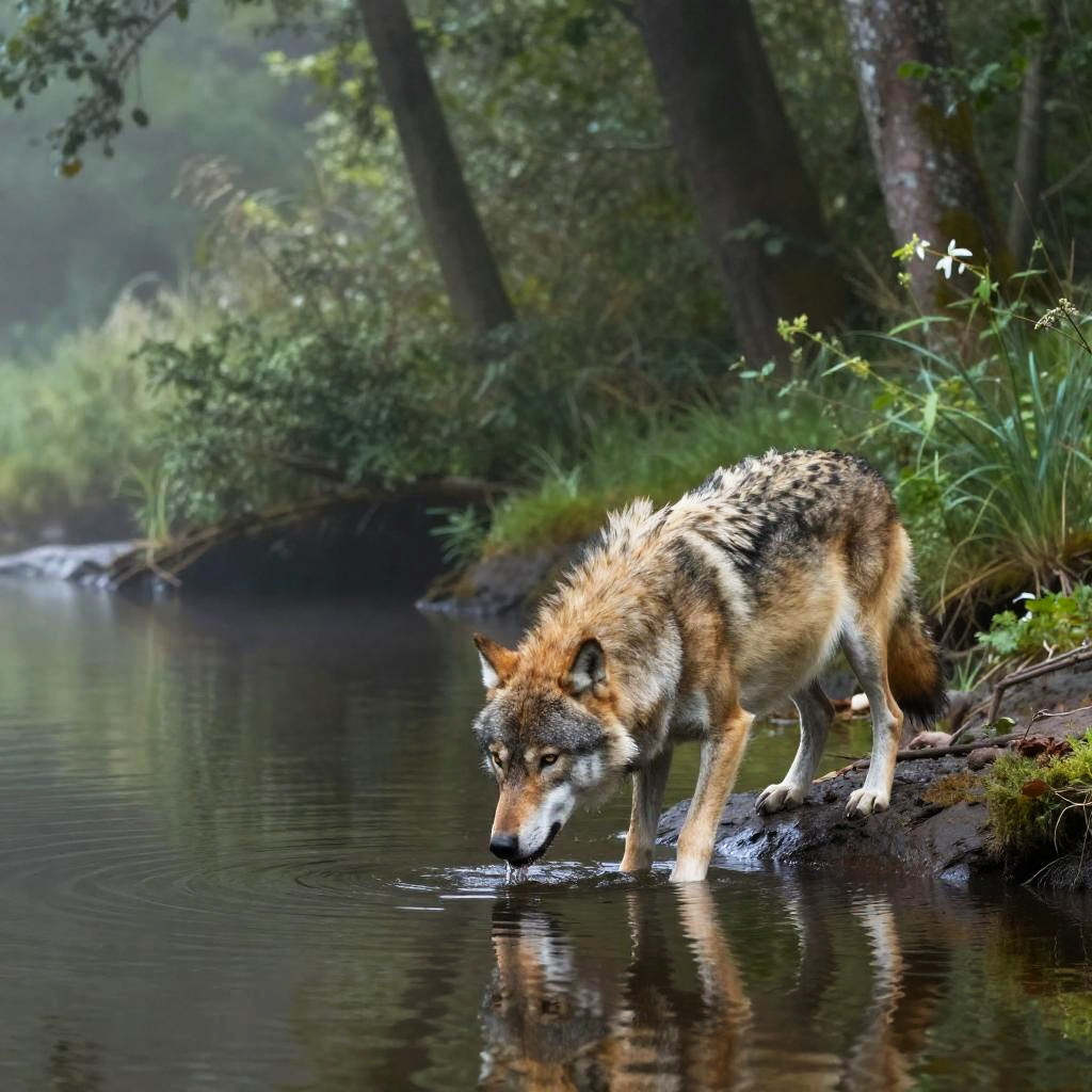 Wolf Drinking at Misty Forest Riverbank