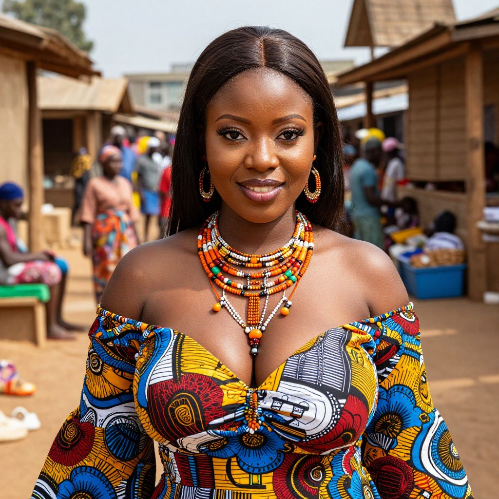 A stunning woman with deep brown skin, vibrant eyes, and a warm smile wearing an African-inspired costume featuring colorful Ankara fabric, bold patterns, and intricate beaded details; set in a sun-drenched market in Nigeria, with traditional wooden structures and bustling vendors in the background.. The woman has big tits and cute face