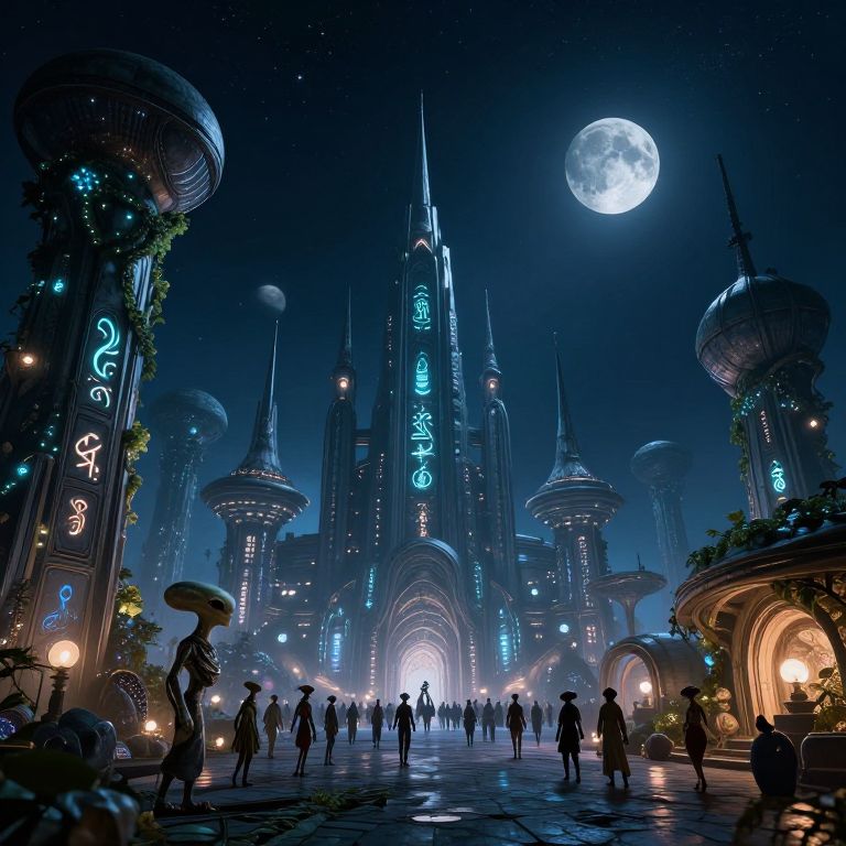 Futuristic alien planet city at night, buildings shaped like giant shells and spires, glowing alien symbols etched into walls, crowds of different extraterrestrial beings wearing unique clothing, bioluminescent vines crawling over architecture, multiple moons visible in starry sky