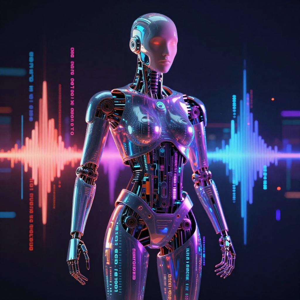 Ai album art portraying an abstract fusion of sound waves and digital code flowing through a sleek robotic figure, illuminated by vibrant neon colors, combining elements of artificial intelligence, rhythm, and futuristic art in a harmonious and eye-catching design