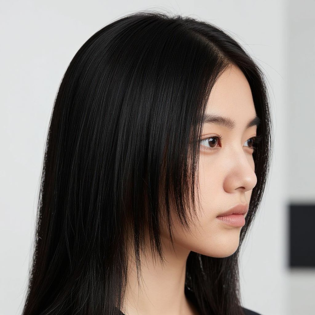 Try on black hair style in a modern fashion studio, soft natural lighting highlighting sleek, shiny black strands, close-up portrait of a young woman experimenting with different black haircuts, minimalistic background, high detail, realistic texture