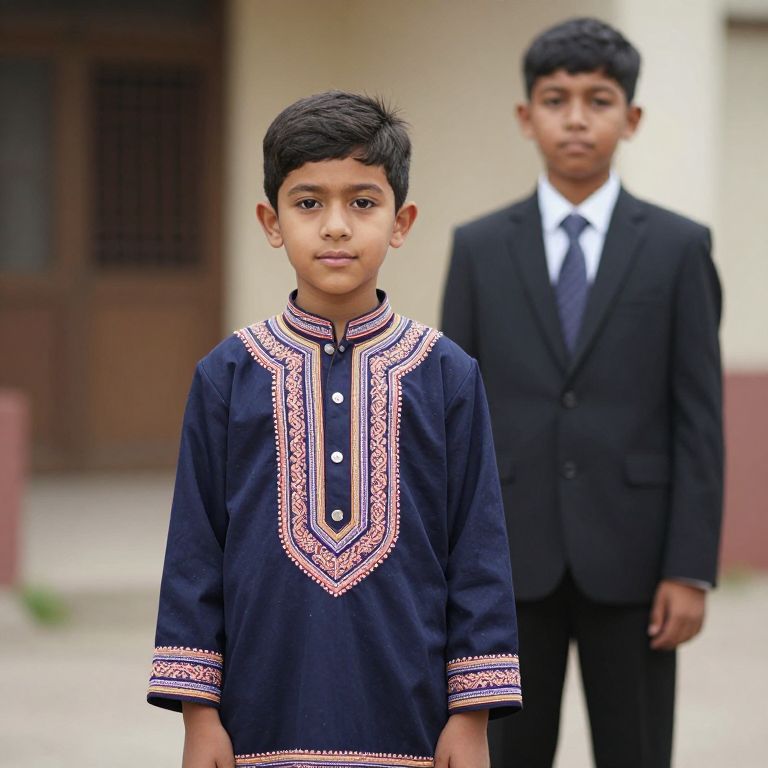 Photograph of a young South Asian boy with short black hair, wearing a dark navy traditional kurta with intricate pink and white embroidery along the neckline and sleeves. He stands in the foreground, facing the camera with a neutral expression. In the blurred background stands an older South Asian man with short black hair, wearing a black suit, white shirt, and black tie. The background includes a beige wall and a brown wooden door. The image has a sharp focus on the boy, with the man slightly out of focus behind him.