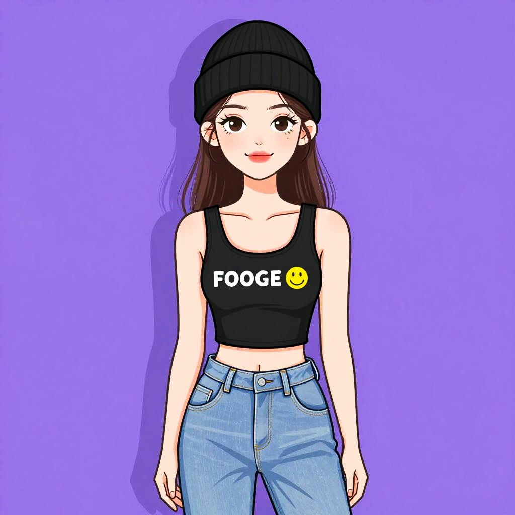 Digital anime-style drawing of a young woman standing against a solid purple background. She has long, straight brown hair, fair skin, and large, expressive brown eyes with small, white freckles on her cheeks. She wears a black beanie, a black sleeveless crop top with the word "FOGGY" in white letters and a yellow smiley face emoji below it, and light blue high-waisted jeans. Her arms are relaxed at her sides. The art style is characterized by bold lines, vibrant colors, and a slight cel-shading effect, typical of modern anime illustrations.