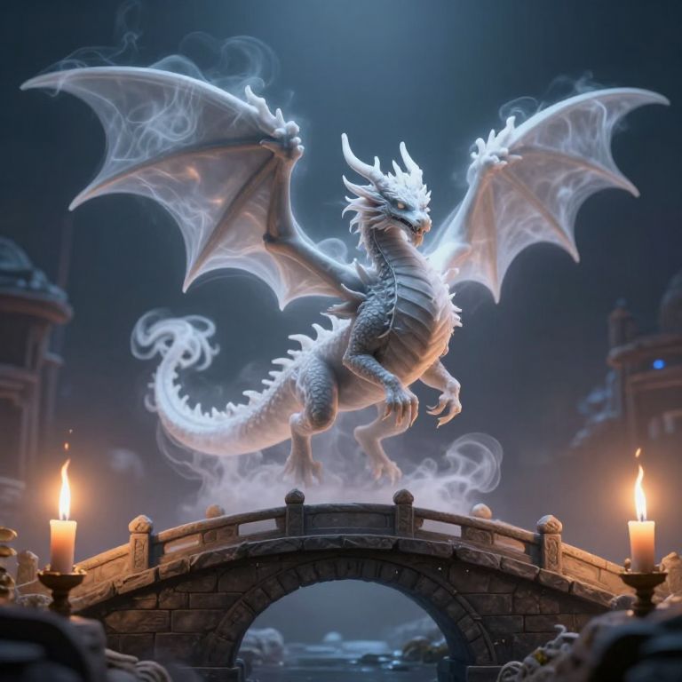 A fantastical 3D-rendered dragon, crafted from ethereal smoke, gracefully dances atop a stone bridge illuminated by flickering candle flames, creating a mesmerizing interplay of light and shadow in a dreamlike, cyberpunk-inspired setting.