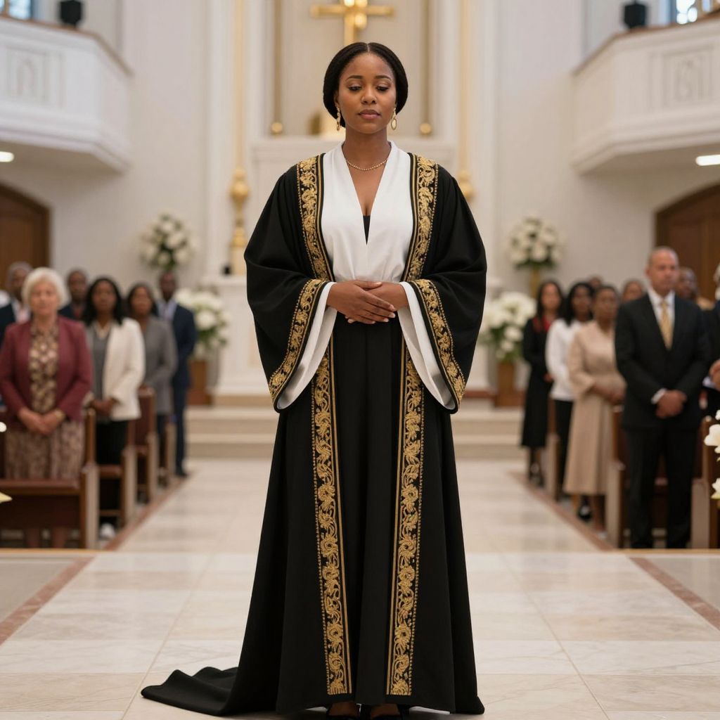 A realistic photorealistic image of a confident female worship leader in a formal and elegant worship leader outfit, featuring a flowing white blouse with a deep V-neck, a fitted black robe with gold embroidery, and a long train, standing in a brightly lit church sanctuary during a Sunday service, the soft glow of church lights reflecting off her face, which has warm, serene eyes and a calm expression, with a small group of congregants in the background.