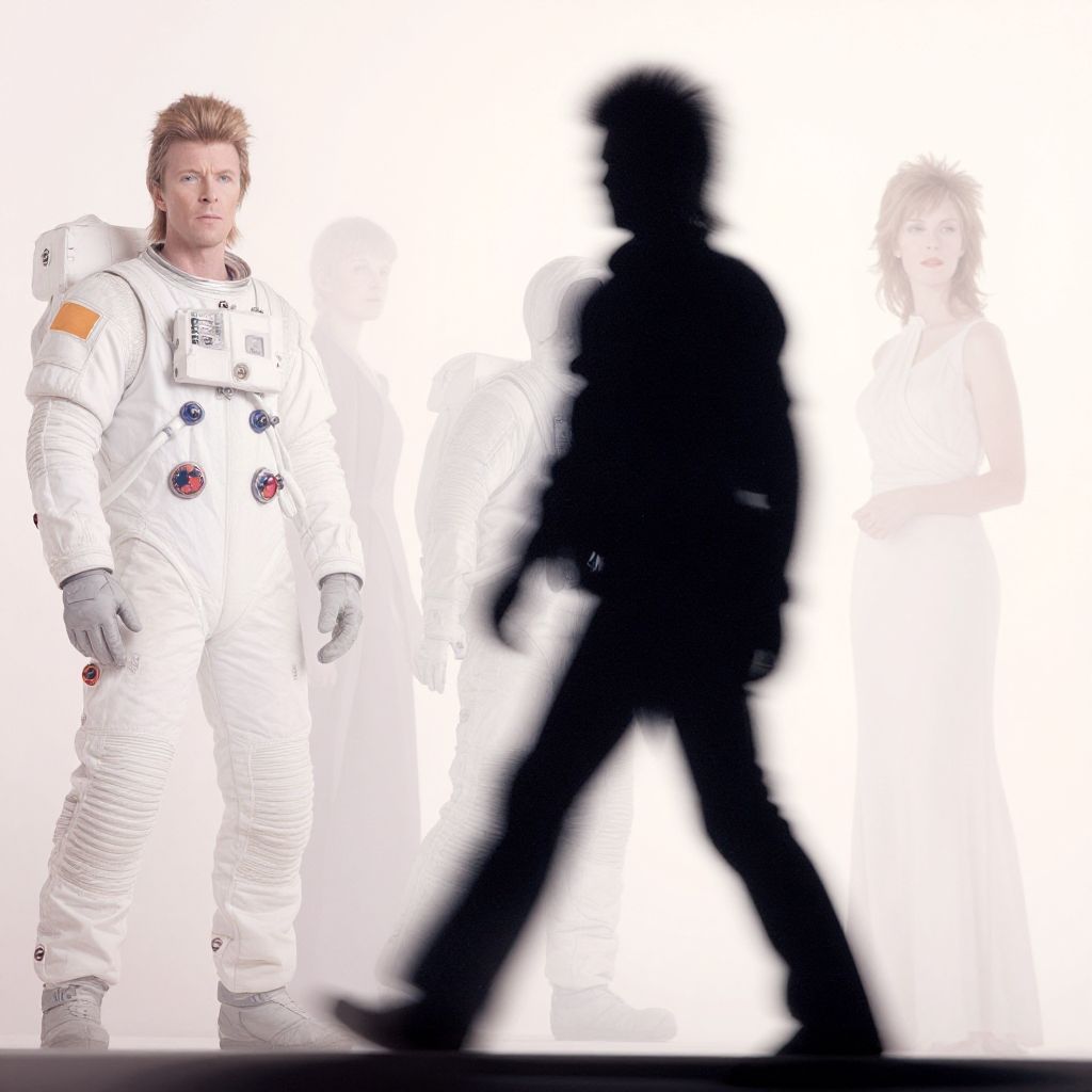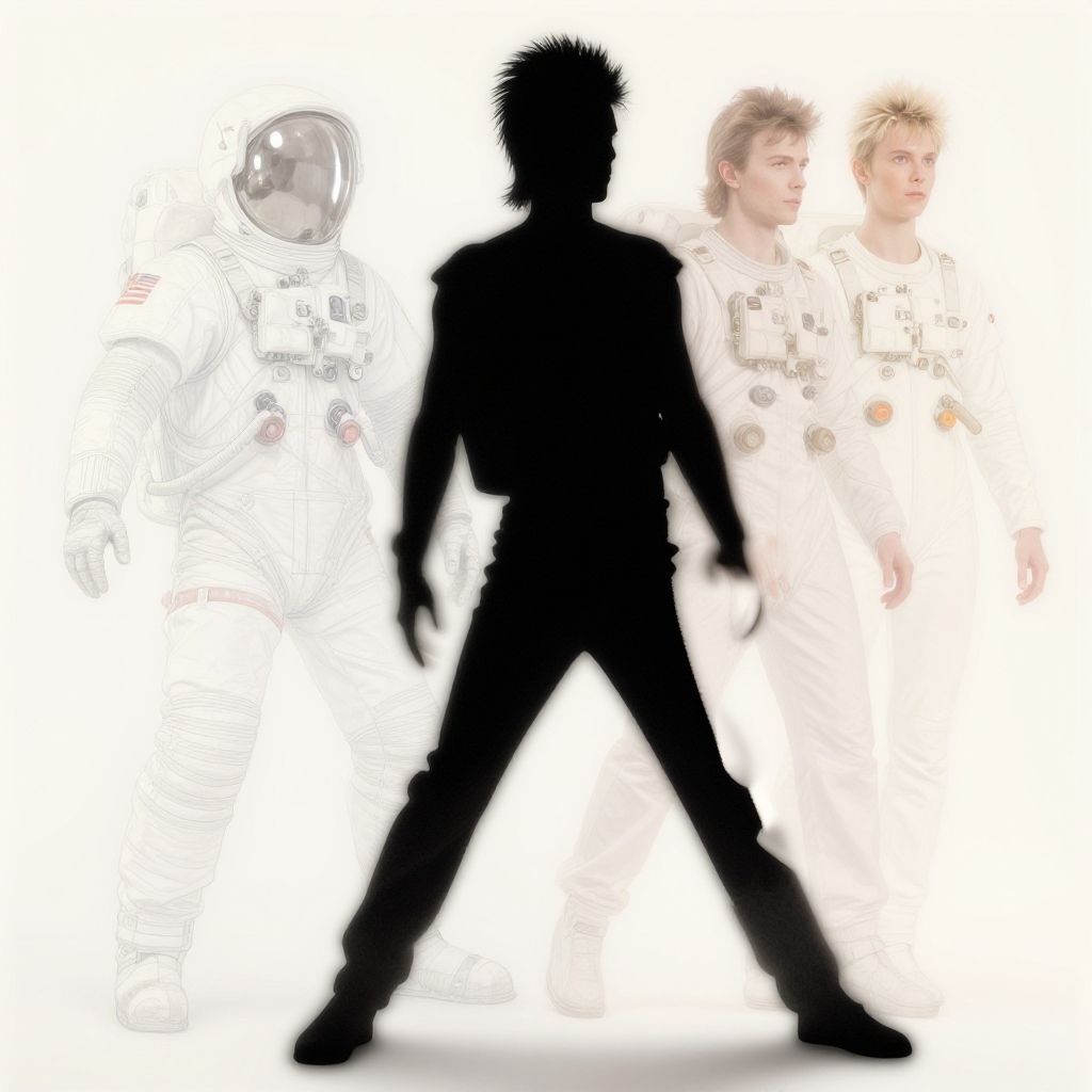 (silhouette:2), highly detailed linework reminiscent of Carne Griffiths, imbued with Wadim Kashim's bold texture, light and airy as Carl Larsson's compositions, a David Bowie Man 18-20 years old, motion, featuring Pascal Blanche-style hyper-realistic characters, pastel, elegance, dramatic lighting, expressive camera angle, matte, concept art, linquivera, (details represented of starman) ( ultradetailed astronaut clothes)