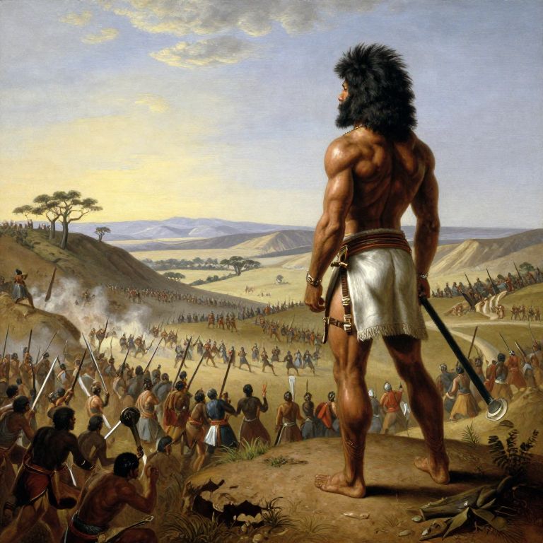 Magic Artpiece of Shaka Zulu standing on a ridge, looking down a valley planning the upcoming battle, in the Style of Frans Snyders,
