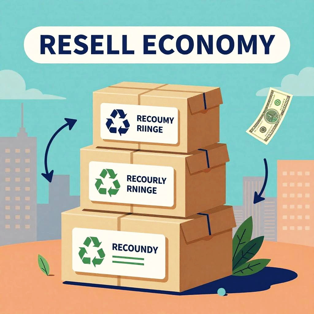 Abstract representation of resell economy, stacked packages, arrows indicating exchange and money flow, cityscape backdrop, vibrant colors symbolizing trade and sustainability, artistic and conceptual style emphasizing reuse and community impact.