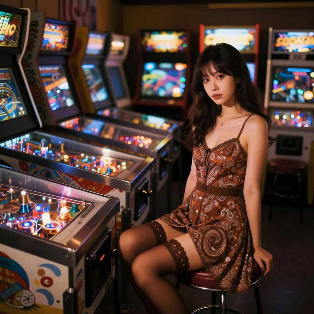 Photograph of an Asian woman with long black hair and fair skin, sitting on a stool in a brightly lit arcade. She wears a white, spaghetti-strap crop top with pastel stripes and a multi-colored ruffled skirt, paired with white thigh-high socks. Her left leg is crossed over her right. The background features multiple illuminated arcade machines with colorful screens and buttons. The woman gazes slightly downward with a neutral expression. The arcade is dimly lit, with neon lights reflecting off the machines, creating a vibrant, nostalgic atmosphere.