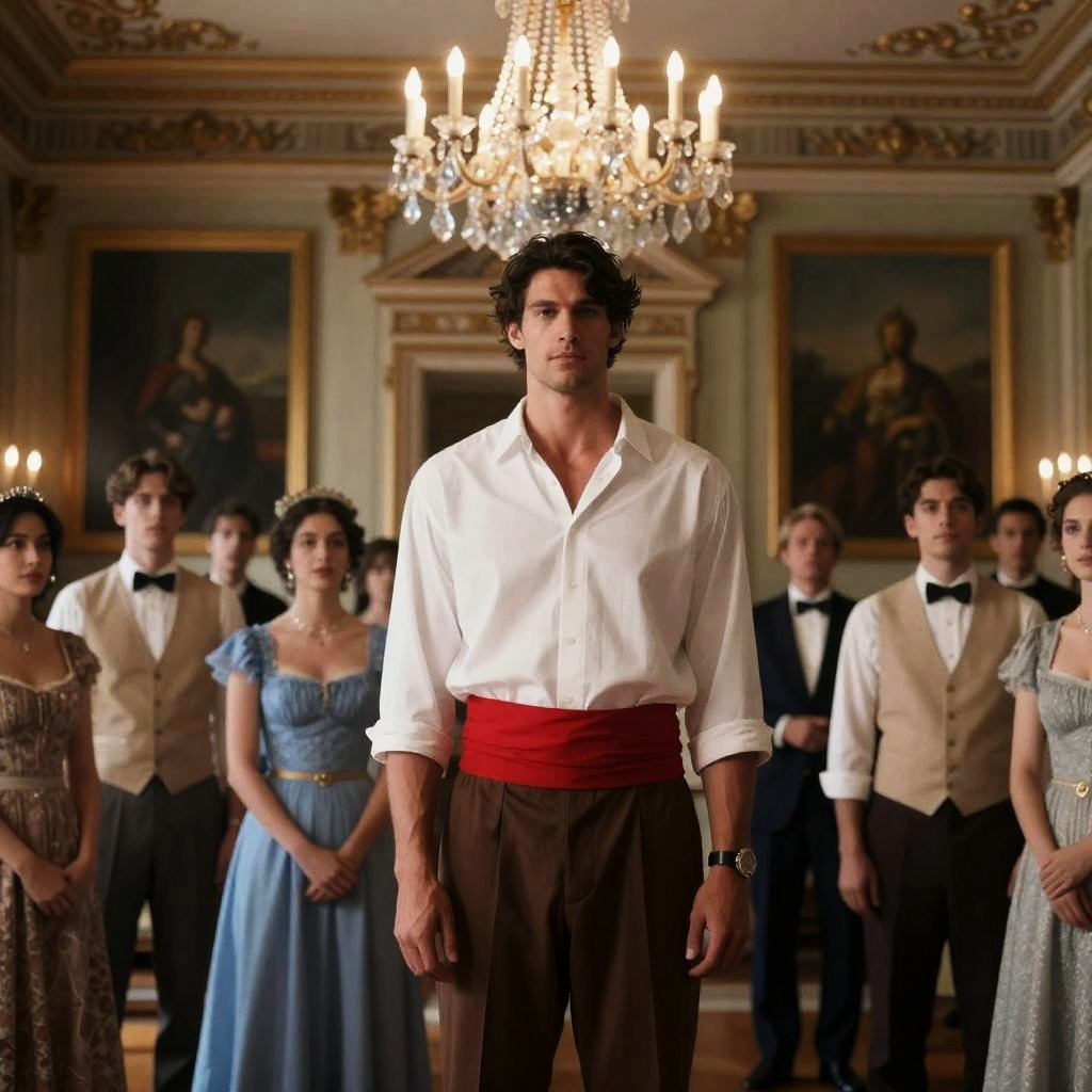 Photograph of a lavish room with a large crystal chandelier. A tall, muscular man with dark hair, white shirt, brown pants, and red sash stands in the center. Surrounding him are elegantly dressed people, including a woman in a blue dress and a man in a beige vest. Background features ornate paintings and a high-ceilinged room. Facial expressions are neutral to relaxed. Multiple people are present, creating a crowded scene.