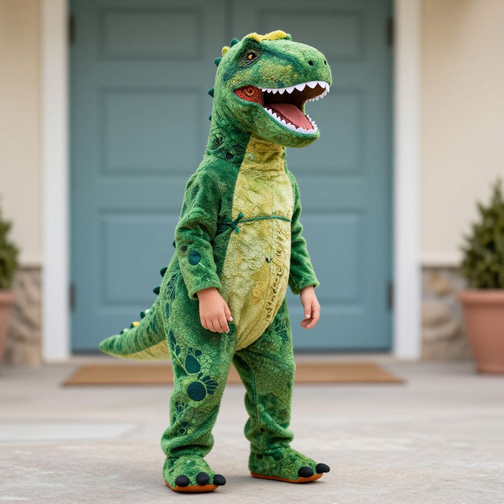 Rex Kid Costume, child in a dinosaur costume standing in front of a building