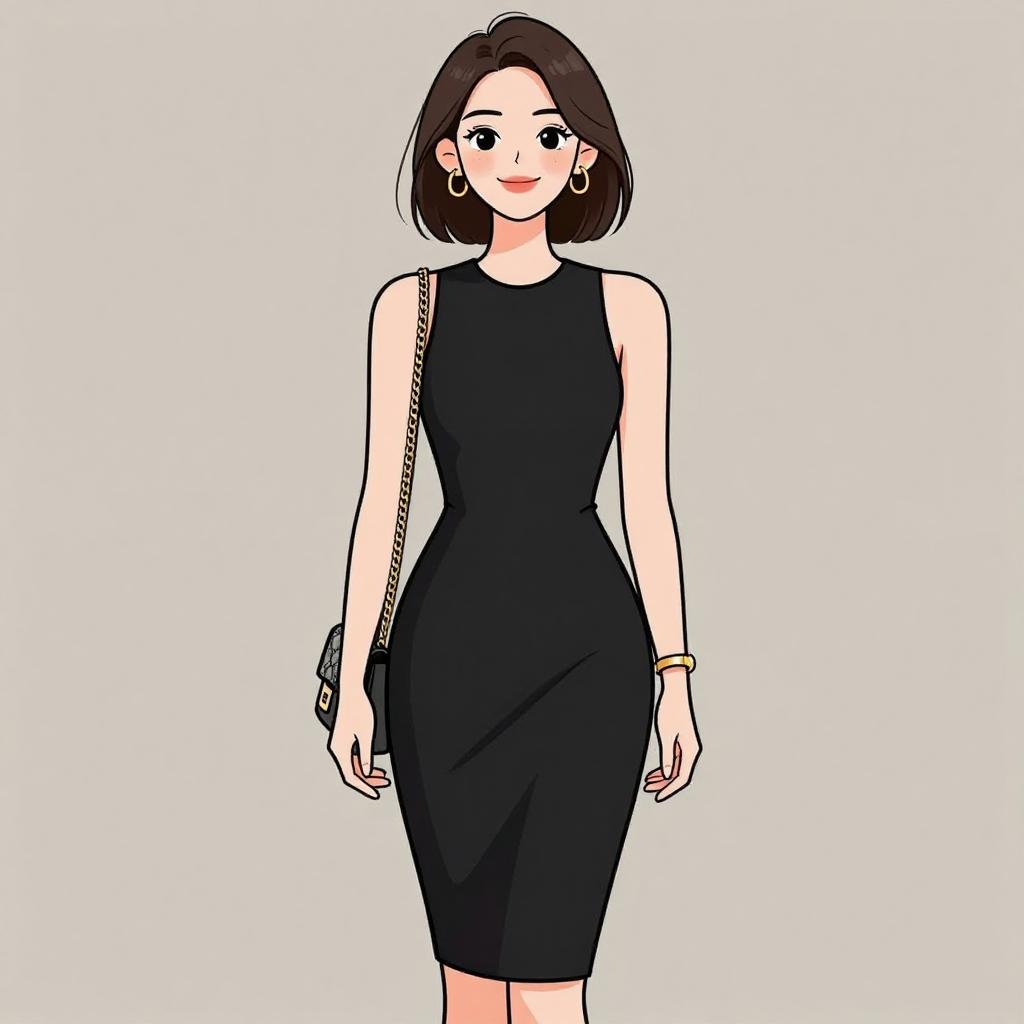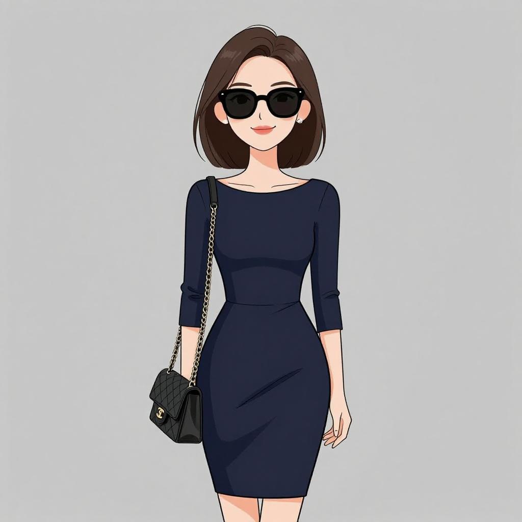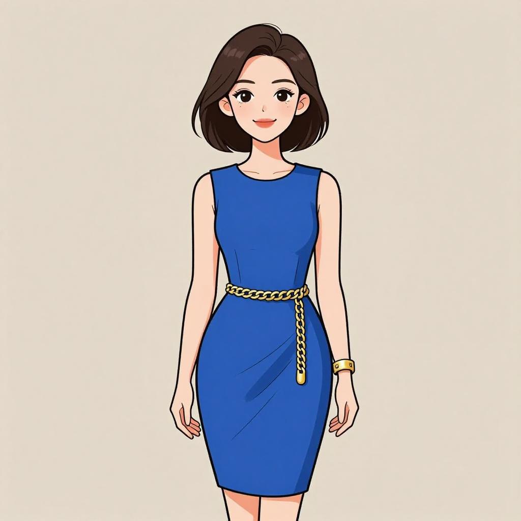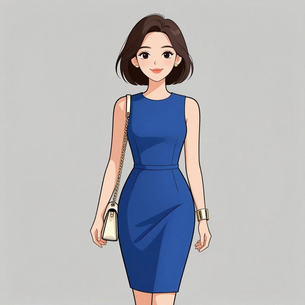 Woman with pretty face and pretty hair. smiling Woman, chic, royal blue sleeveless shift dress, high neckline, pleated front, above-knee length, small cream shoulder bag with chain strap, wide metallic cuff bracelet. --sref 1467