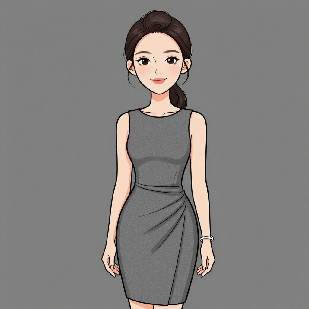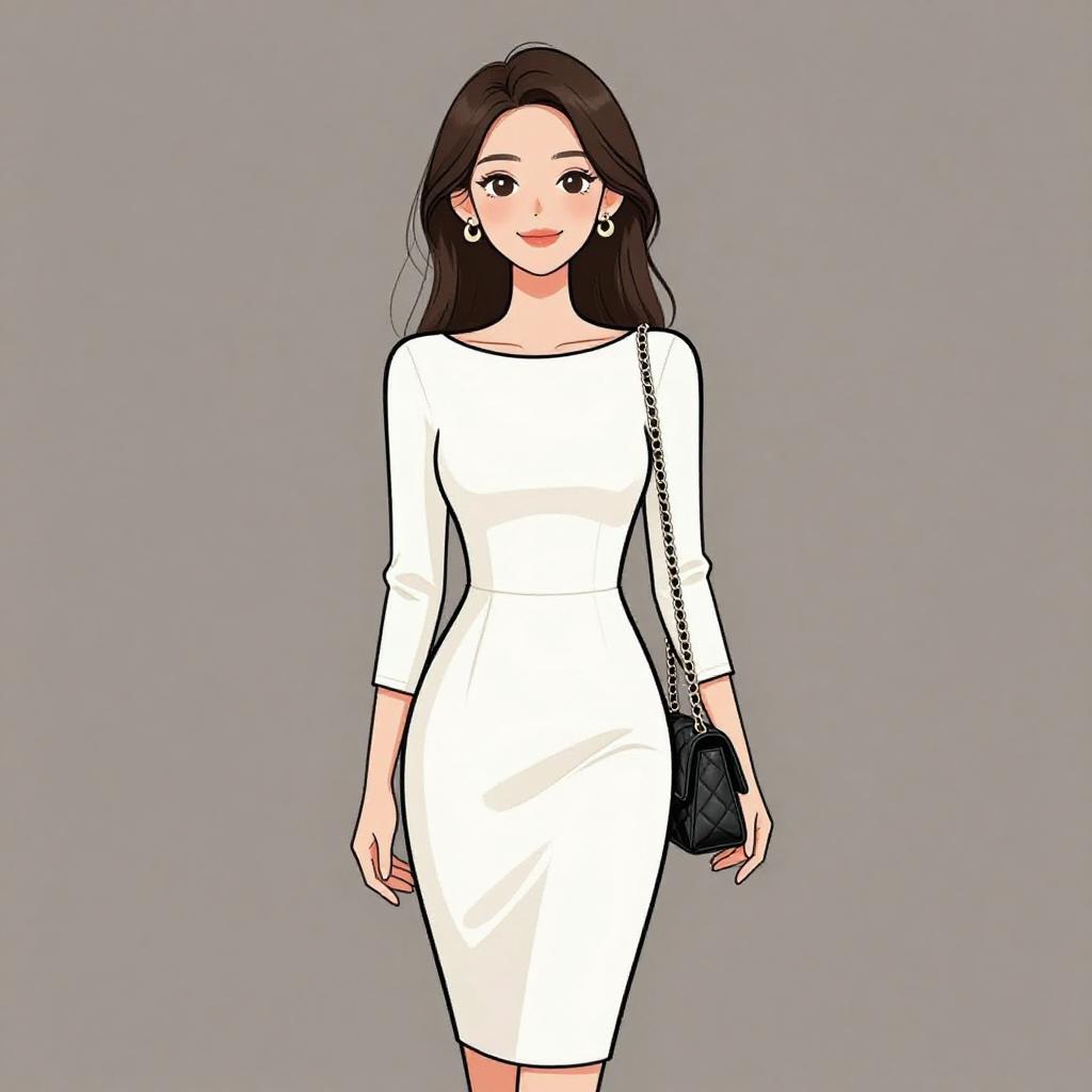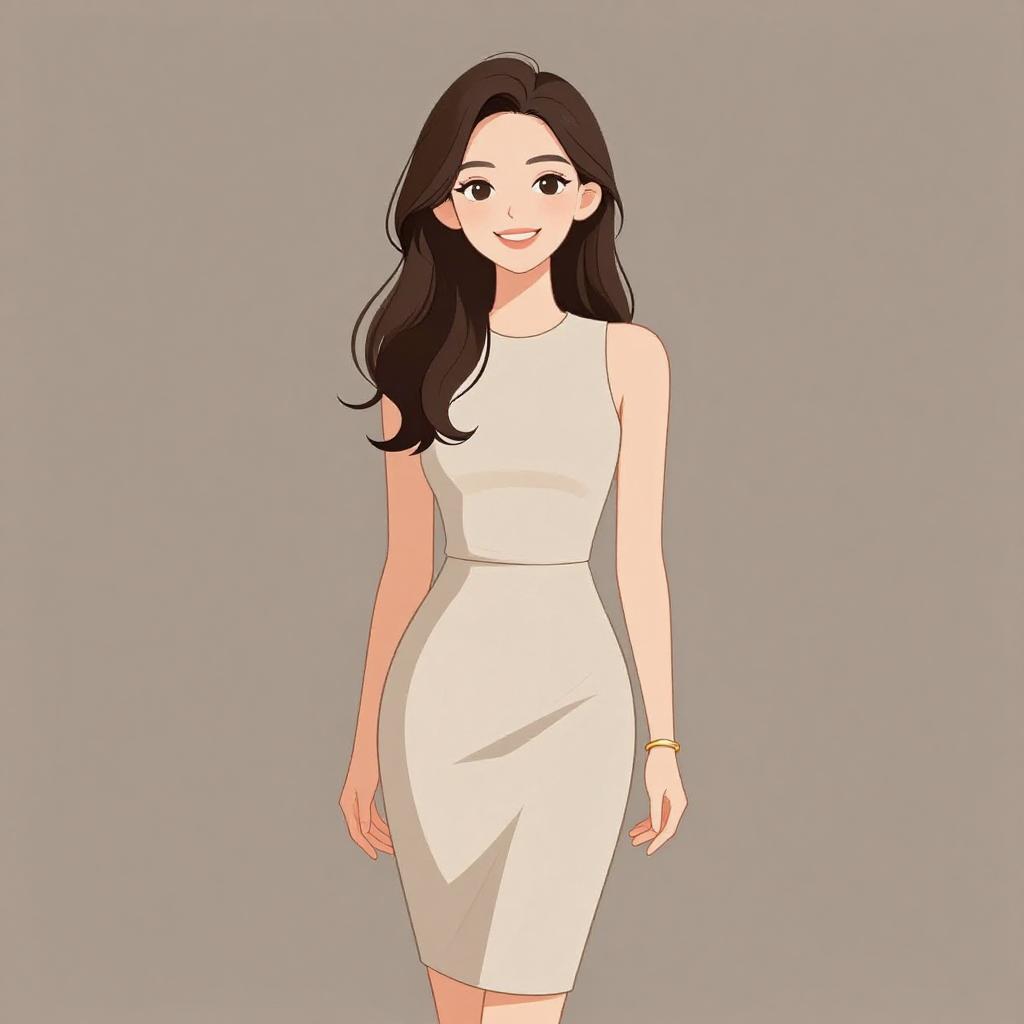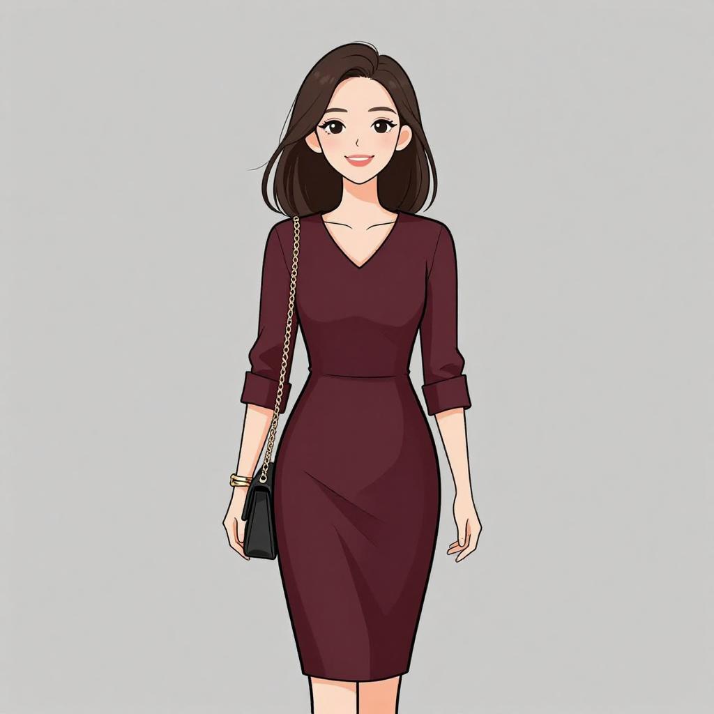 Woman with pretty face and pretty hair. smiling Woman, chic, royal blue sleeveless shift dress, high neckline, pleated front, above-knee length, small cream shoulder bag with chain strap, wide metallic cuff bracelet. --sref 1467