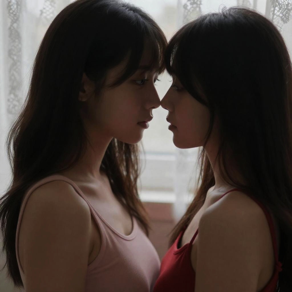 Two women in an intimate close-up, facing each other, eyes locked, foreheads almost touching. Dark hair, lit from behind. One woman in a pink tank top, other in a red strap top. Soft light, lace curtain, tinsel. Emotionally charged.