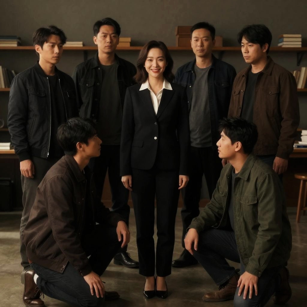 Group of ten people walking in a city street at night, wearing formal and semi-formal clothes. Leading man in white suit, holding a cardboard box, central. Woman in brown dress with orange hair on left. Background includes parked cars, building walls, and illuminated street. Intense, determined expressions on some faces.