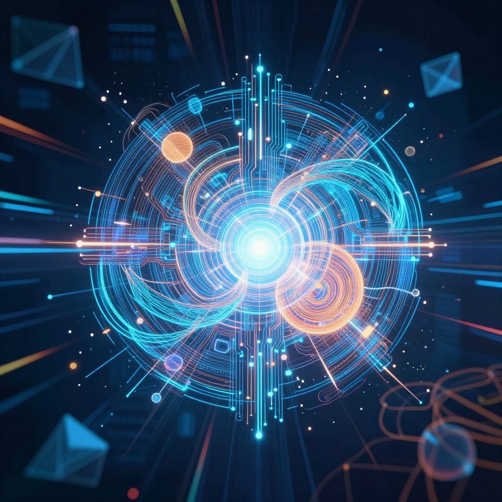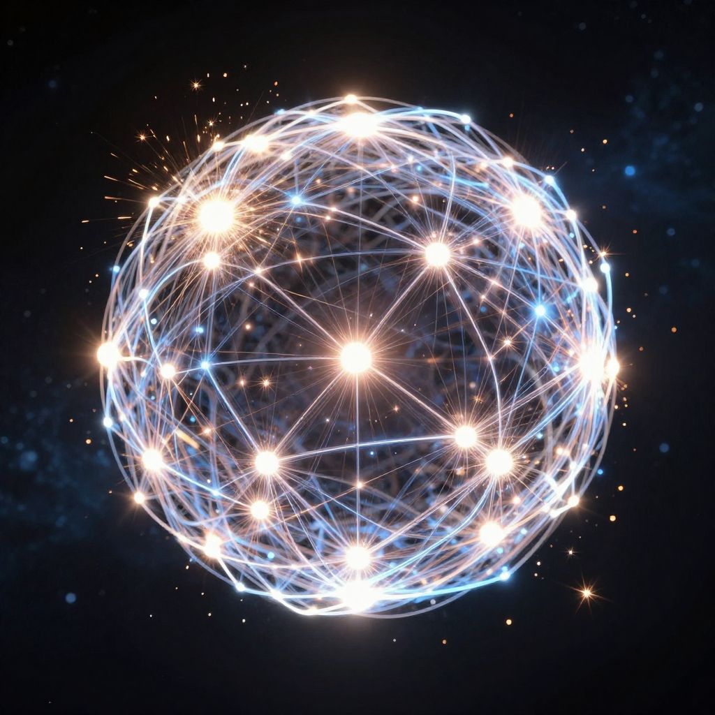 Open AI generator visualized as a dynamic 3D neural network expanding outward, electric energy pulses connecting nodes across a deep space backdrop, sci-fi aesthetic with glowing edges, conceptual digital artwork showing intelligence creation and data flow