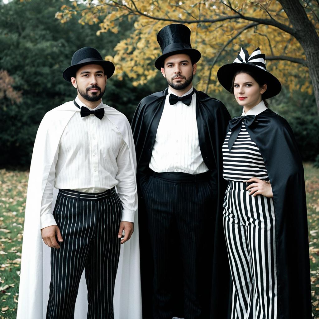 Three adults dressed in coordinated black and white Halloween costumes pose outdoors. Two men wear white shirts with black bow ties, striped pants, and capes, one with a white cape and black bowler hat, the other with a black cape and tall top hat. The woman wears a black cape, a black and white striped blouse, striped pants, and a black and white witch hat. The setting appears to be an autumn park with green trees and yellow leaves.
