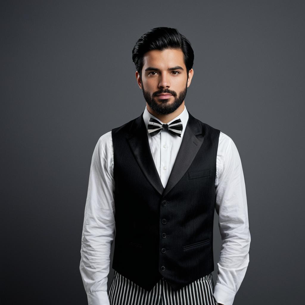 Halloween trio costume man,1boy, solo, male focus, hat, bow, cape, bowtie, black bow, realistic, looking at viewer, striped pants, standing, black headwear, black bowtie, shirt, white cape, facial hair, pants
