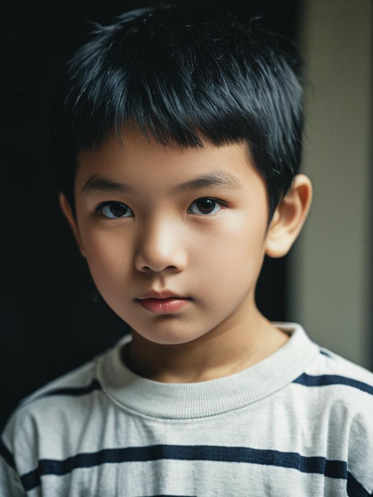 Close-up portrait of a young Asian boy with short black hair, wearing a white and navy striped shirt. The boy is looking directly at the camera with a neutral expression. The background is dark and blurred, highlighting the subject's face and upper body.