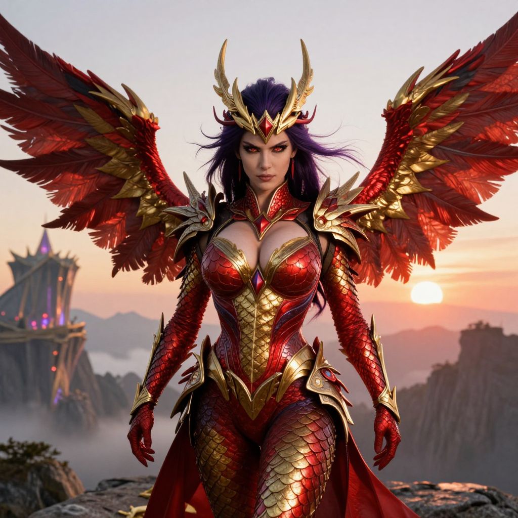 This digital art image depicts a powerful, fantasy-style female warrior with dark blue hair and piercing eyes. She has large, red, feathered wings with golden accents and wears a red and gold, scaled, form-fitting armor that highlights her large breasts. A golden, horned helmet crowns her head. The background features a misty, mountainous landscape at sunset, with a colorful, castle-like structure on the left. Her stance is confident, with her arms slightly forward. The overall style is highly detailed and vibrant, with a focus on fantasy and mythical elements.