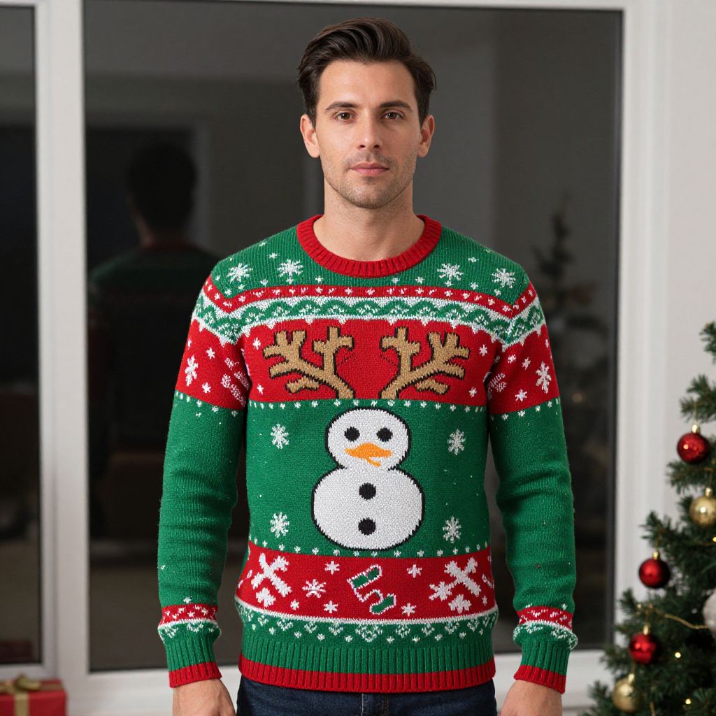 Fancy Christmas Sweaters Costume, man in a green and red sweater standing in front of a window