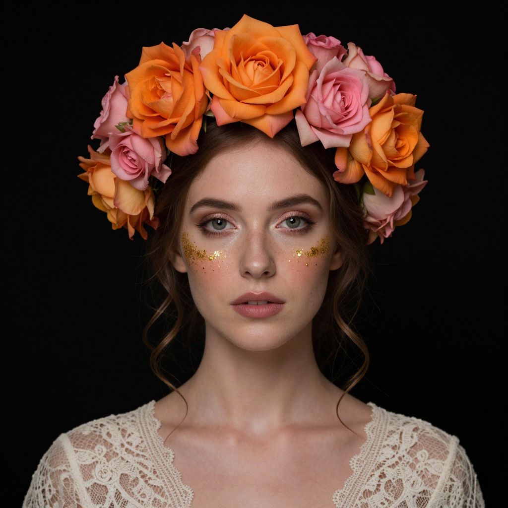 Photograph of a young woman with fair skin and blue eyes, centered against a black background. She wears a floral crown adorned with vibrant orange and pink roses. Her brown hair is loosely curled and partially visible. She has subtle gold glitter on her cheekbones and wears a delicate, white lace top. Her expression is calm and neutral. The black background contrasts sharply with her bright floral crown and lace top, emphasizing her ethereal, natural beauty. The image is sharply focused, highlighting the textures of the lace and the soft petals of the flowers.