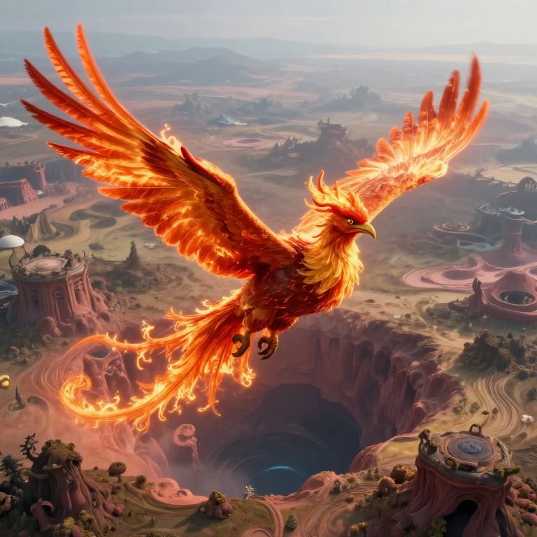A surreal digital artwork depicting an aerial view of a timeless landscape, where a majestic phoenix ascends from the remnants of an ancient city. The vibrant scene is characterized by a dreamlike atmosphere and a palette of vivid colors, as the bird's iridescent feathers shimmer in the ethereal light casting intricate shadows on the crumbling architecture below. The powerful wings of the phoenix carry it towards an uncertain future while leaving behind echoes of a forgotten past, creating a sense of timelessness that evokes both awe and wonder.