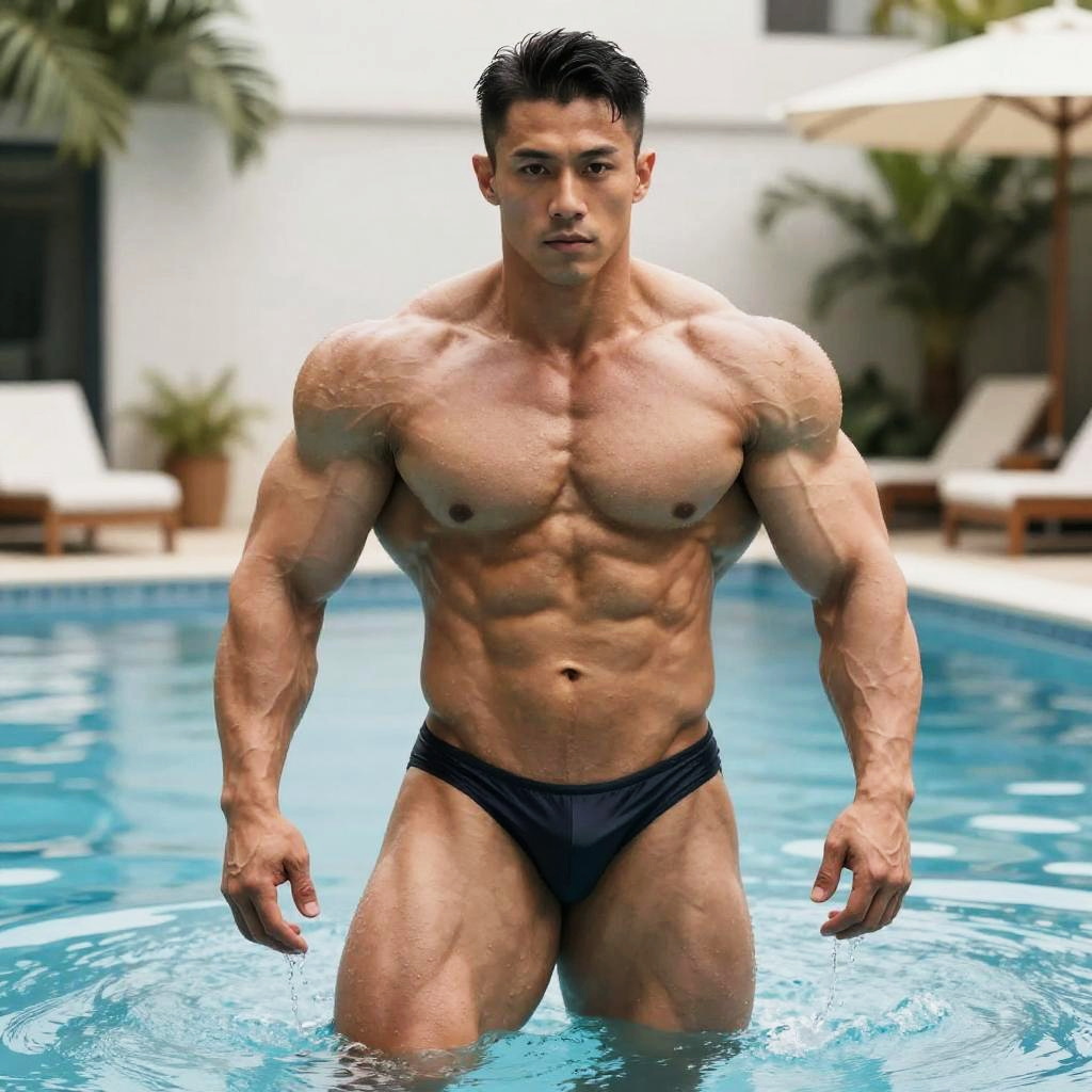 Best quality, ultra high res, (photorealistic:1.4), 1guy, extremely muscular steroid bodybuilder in the pool, muscle definition, olympia, bikini